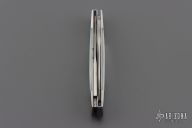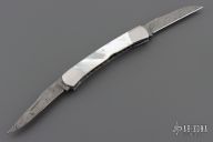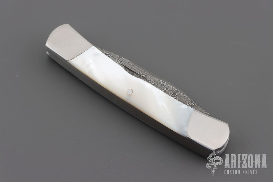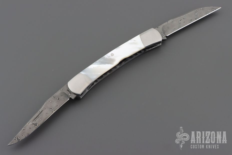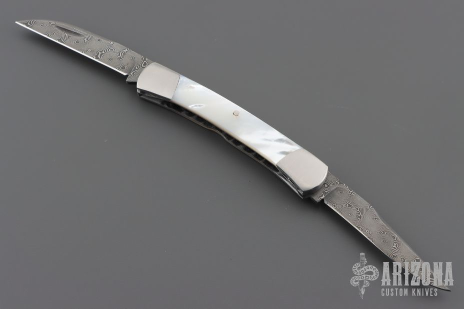 This 2-Blade Trapper by Murray Sterling features Damascus blades with nail nicks. The handle has dovetailed stainless steel bolsters with integral liners, mother of pearl covers, stainless steel liners and springs. Has half-stops, flush in all positions. Excellent condition. Comes with a zippered case.