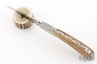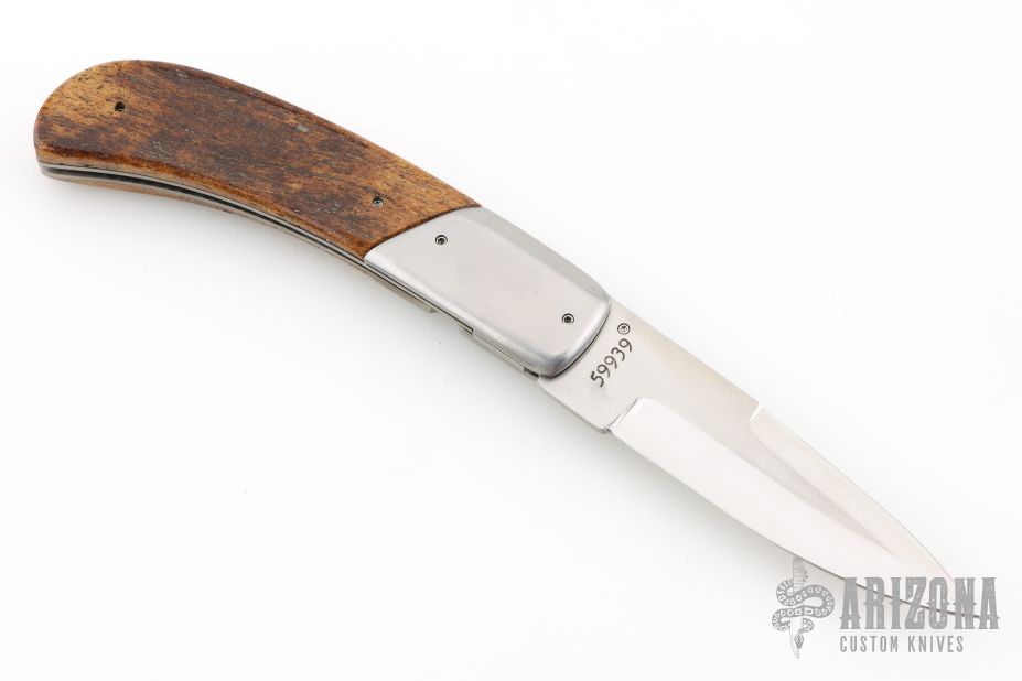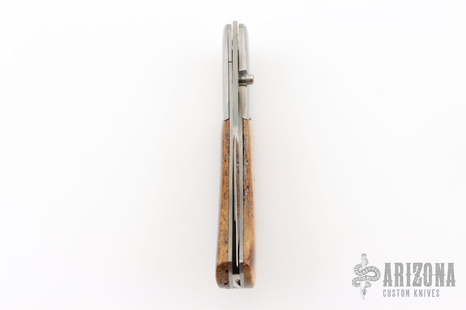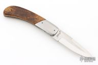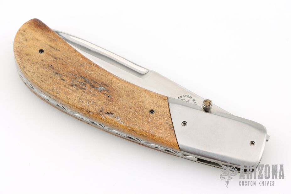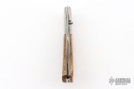 This linerlock by Dan Mink features two-tone blade with single thumbstud with mammoth bone inlay. The handle has stainless steel dovetailed bolsters, mammoth bone scales, titanium liners with jeweled interiors, fileworked stainless steel backspacer. Nice detent and lockup. Comes with a zippered case. Has a couple light scratches, otherwise excellent condition.