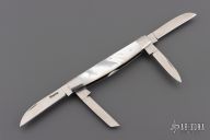This slipjoint by Bill Simons features satin finished blades with nail nicks. The handle has stainless steel bolsters, mother of pearl covers, stainless steel liners and stainless steel springs. #327 inside the spring. Comes with a zippered case. Excellent condition.