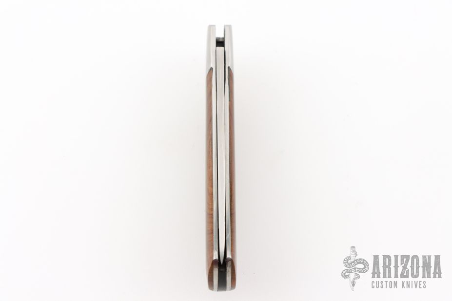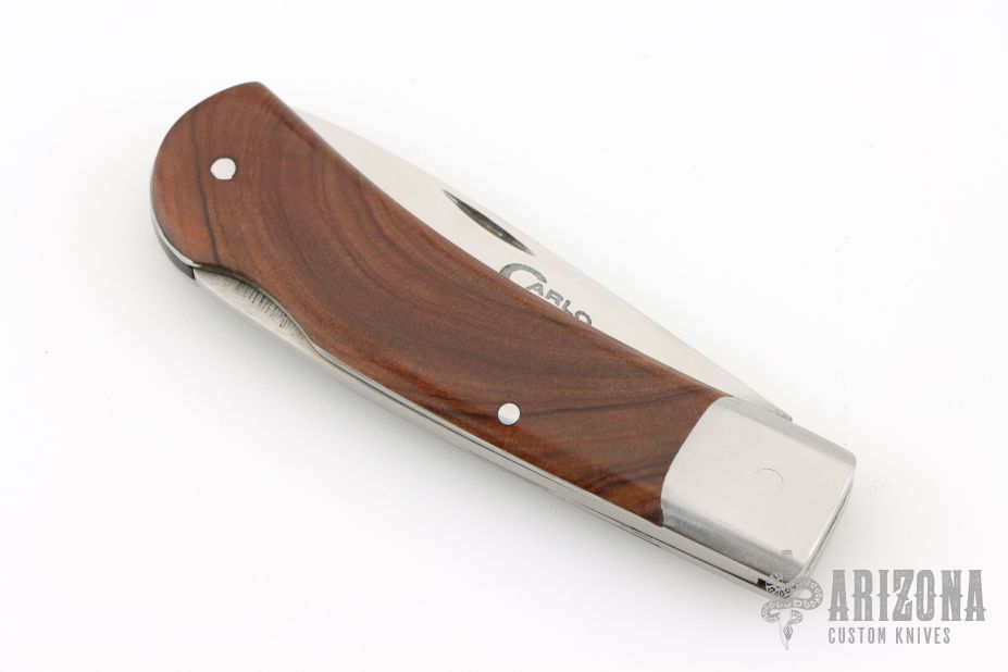 This lockback by Carlo Raineri features a satin finished blade with nail nick. The handle has dovetailed stainless steel bolsters with integral liners, wood scales, stainless steel backspacer. Nice lockup and blade seating. Comes with a zippered case. Has some light scratches, and some very fine cracks in the scales, otherwise good condition.