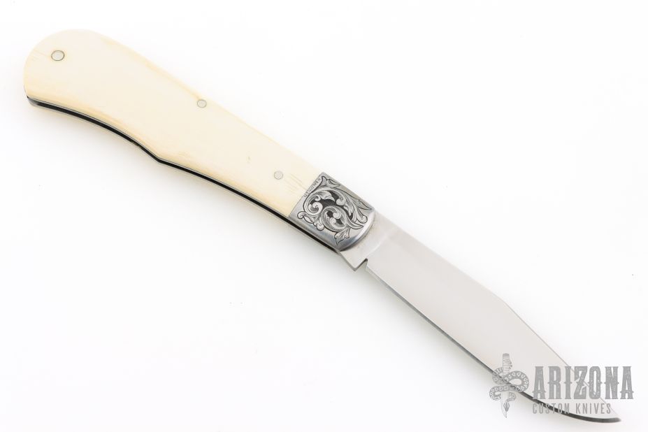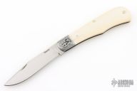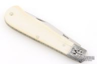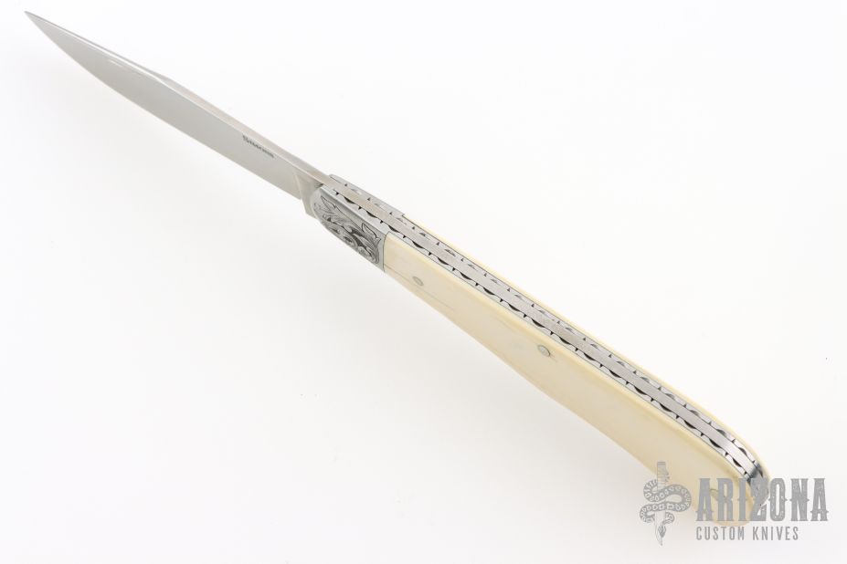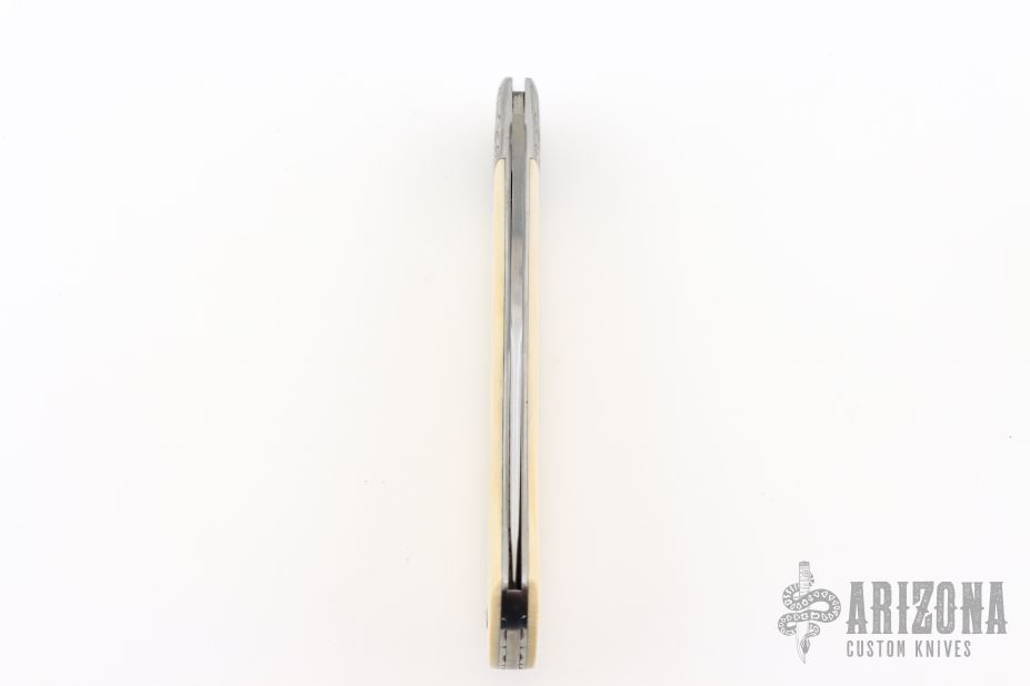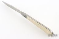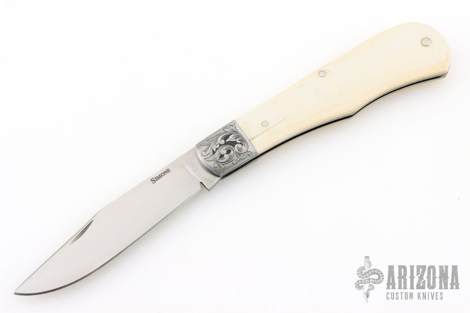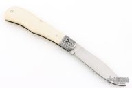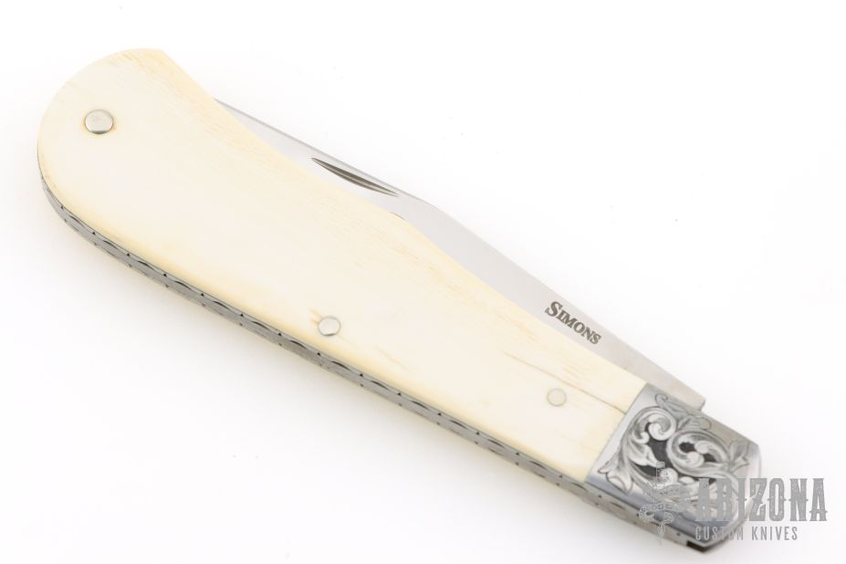 This slipjoint by Bill Simons features a satin finished blade with nail nick. The handle has engraved stainless steel bolsters, mammoth ivory covers, fileworked stainless steel liners, and a stainless steel spring. #483 inside spring. Has a couple of small cracks in the scales, otherwise excellent condition. Engraved by H. Baldwin. Comes with a zippered case.