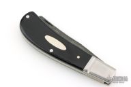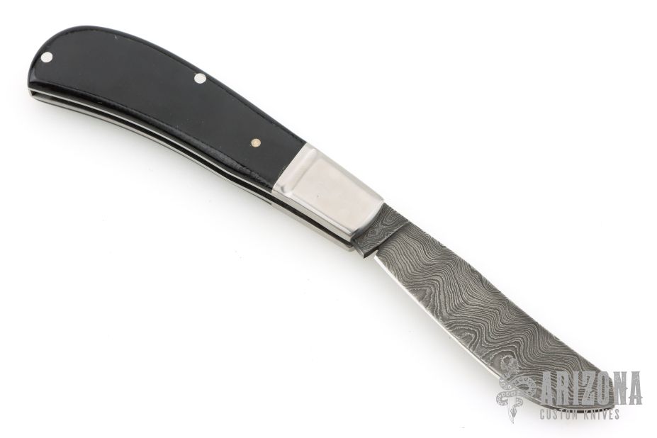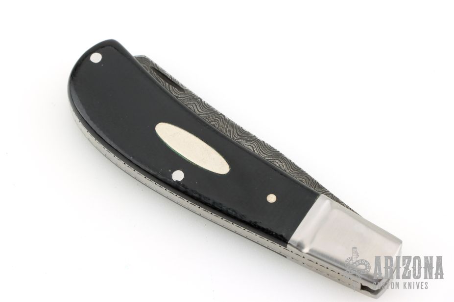 This slipjoint by Bill Simons features a Damascus blade with nail nick. The handle has fluted stainless steel bolsters, black canvas micarta covers with a nickel silver escutcheon, fileworked stainless steel liners, and stainless steel spring. #458. Excellent condition. Comes with a zippered case.