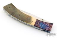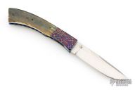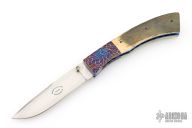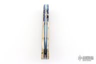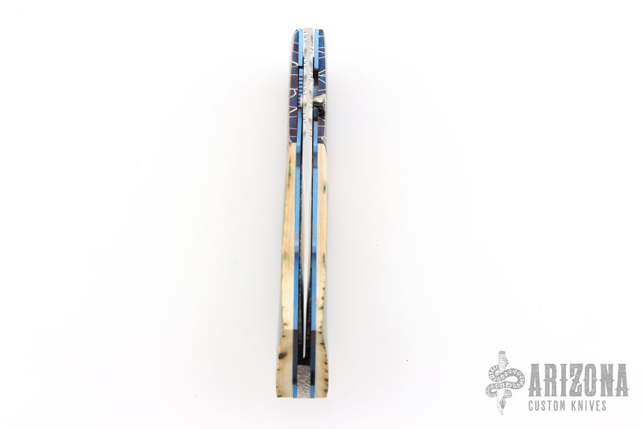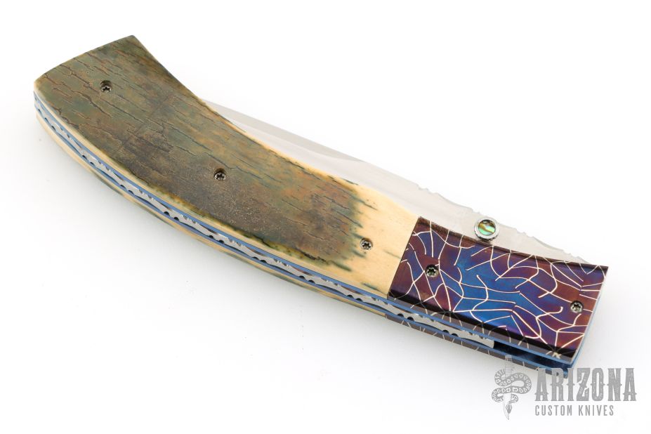 This linerlock folder by Randy Capdepon features a hand rub satin finished blade with fileworked spine and single abalone inlaid thumbstud. The handle has blued mosaic Damascus bolsters, mammoth ivory scales, anodized titanium liners with jeweled interiors, fileworked and textured stainless steel backspacer. Smooth action with a nice detent, lockup and blade seating. Excellent fit and finish. Excellent condition.