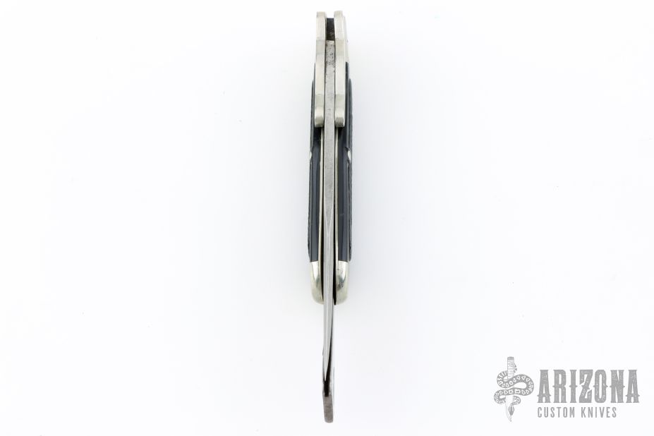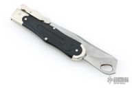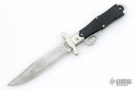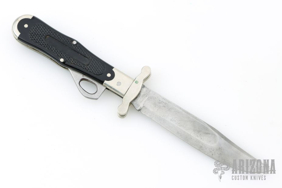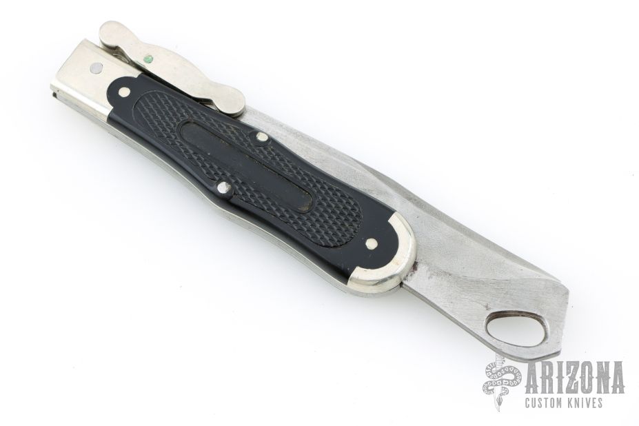 Unique design of the Marbles Safety knife makes this an intriguing piece. It has a satin finished blade, nickel silver swing guard and bolsters, nickel silver liners and steel spring and blade cover. Pinned checkered Delrin covers. Has scuffs, scratches, and patina. Good condition for its age and otherwise.