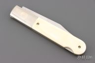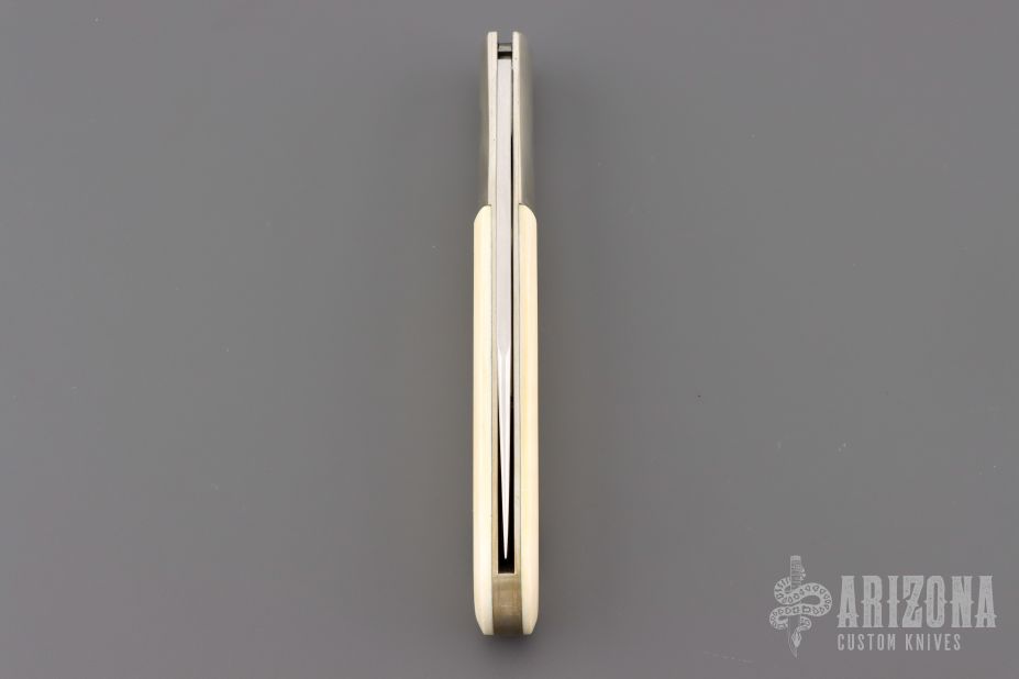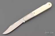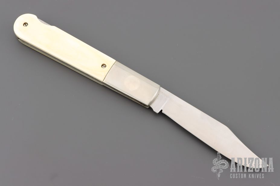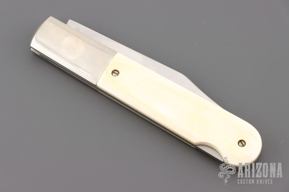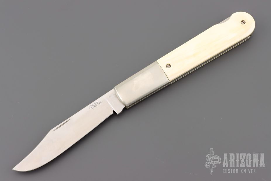 This Grigg Lockback Folder has a satin finished clip point blade with nail nick. The handle has nickel silver bolsters, nickel silver liners, and stainless steel spacer and lockbar, walrus ivory scales. Nice lockup and blade seating. Comes in a soft pouch, and has a light patina. Excellent condition.