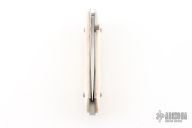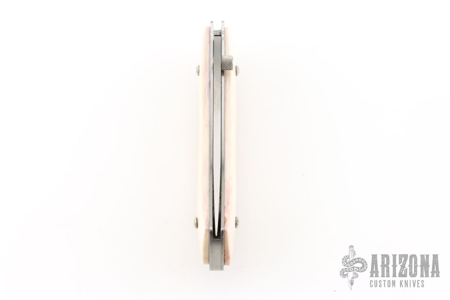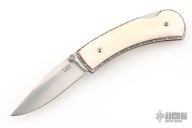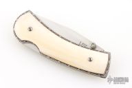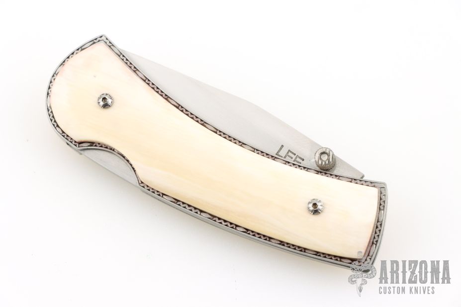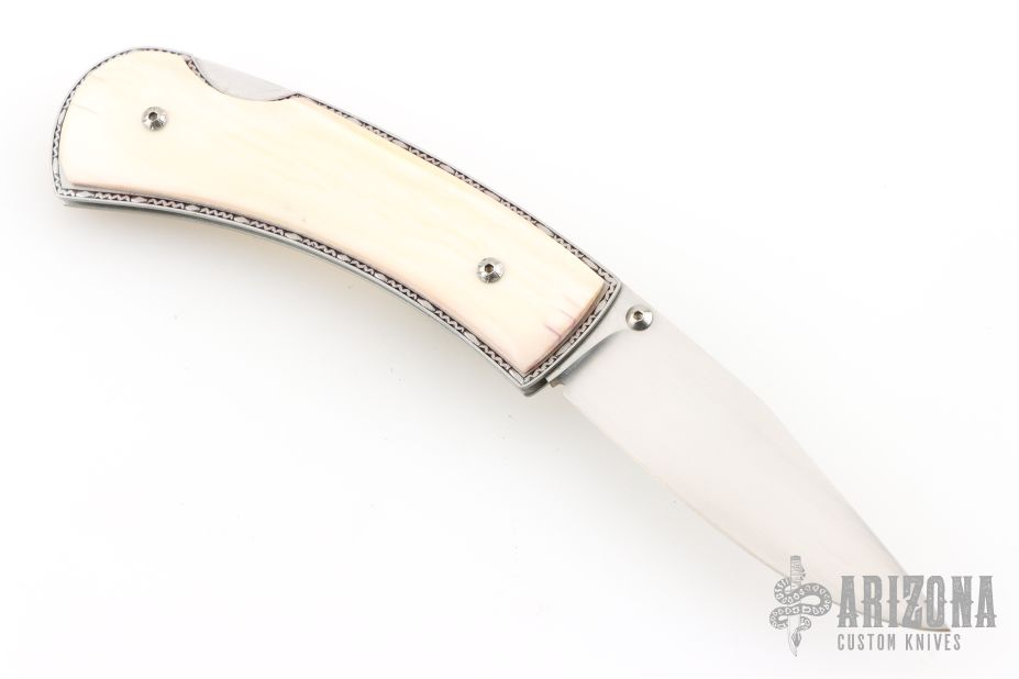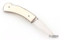 This lockback by Tommy Lee features a hand rub satin finished blade with single thumbstud. The handle has engraved stainless steel frame, mammoth ivory scales, and stainless steel backspacer. Nice lockup and blade seating. Has a couple light scratches, otherwise excellent condition. Michael Wood did the engraving, and is marked MW in the finger choil. Comes with a zippered case.