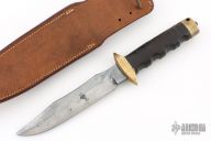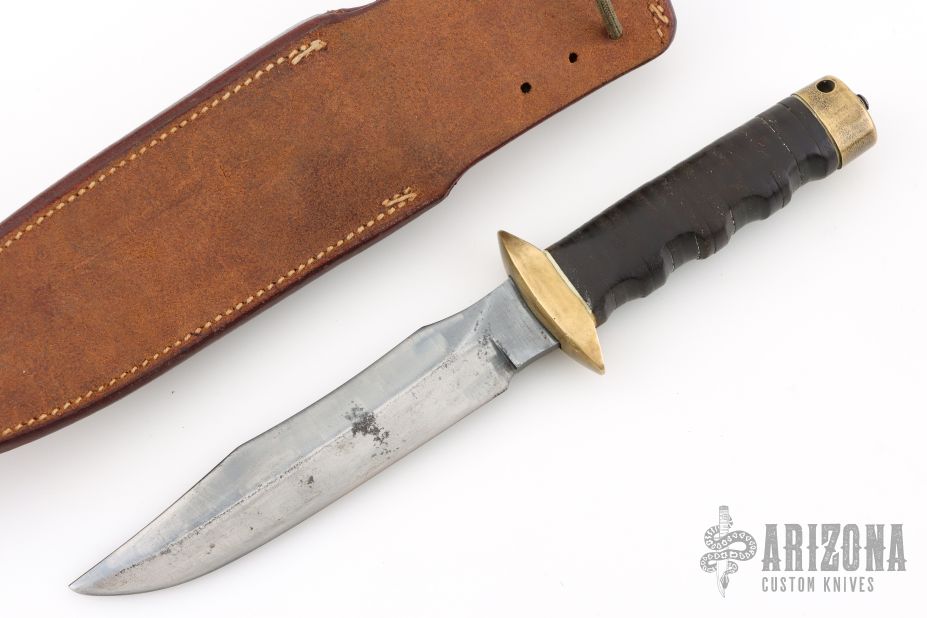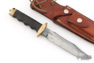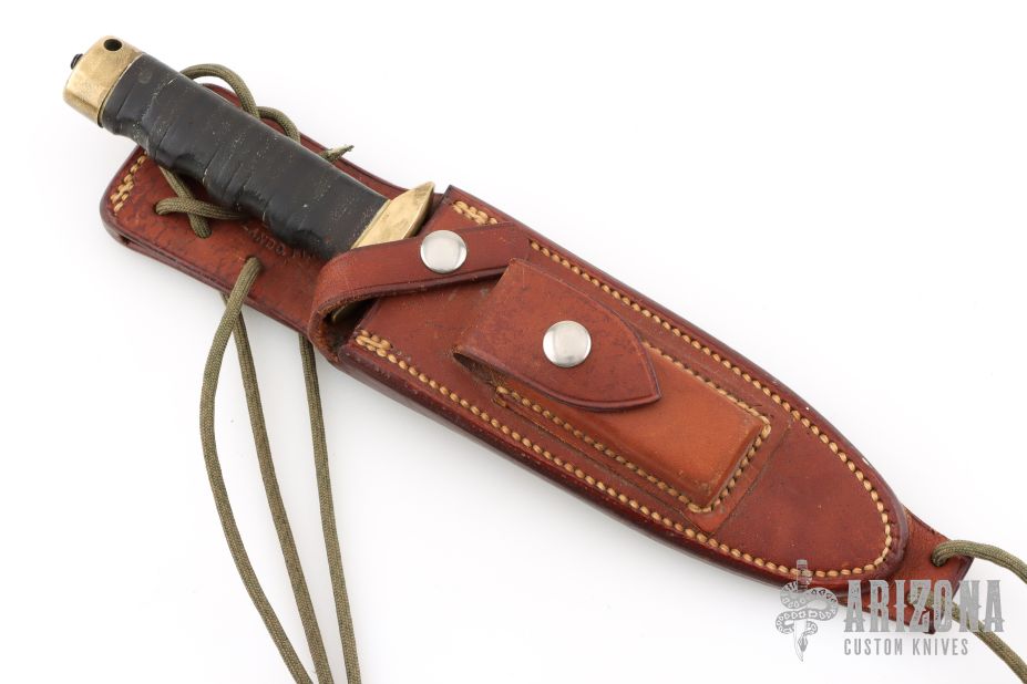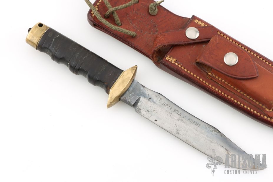 This vintage SOG knife features a satin finished clip point blade with hidden tang construction, .255" blade stock, and 1.440" blade depth. The handle has a brass guard, stacked leather grip, brass pommel with lanyard hole and tang nut. Comes in a Randall Made Knives roughback sheath. This knife is marked SP/4 Bill J. Adams on the blade. There is visible wear, scuffs and scratches. Good condition for its age and otherwise.