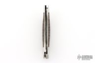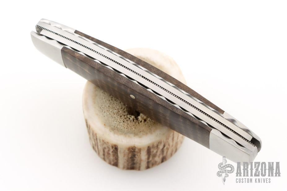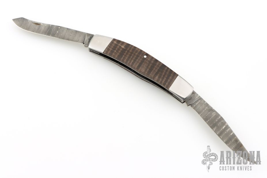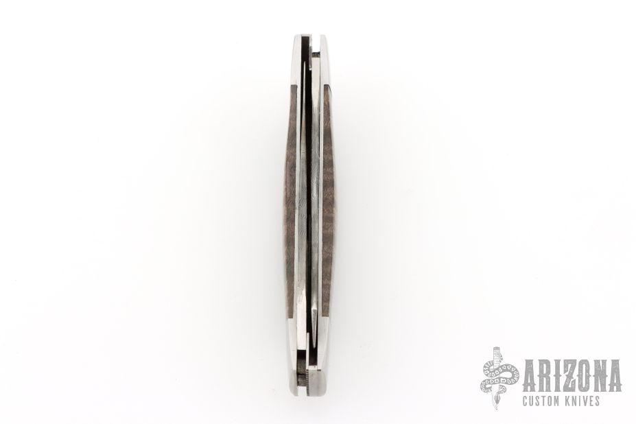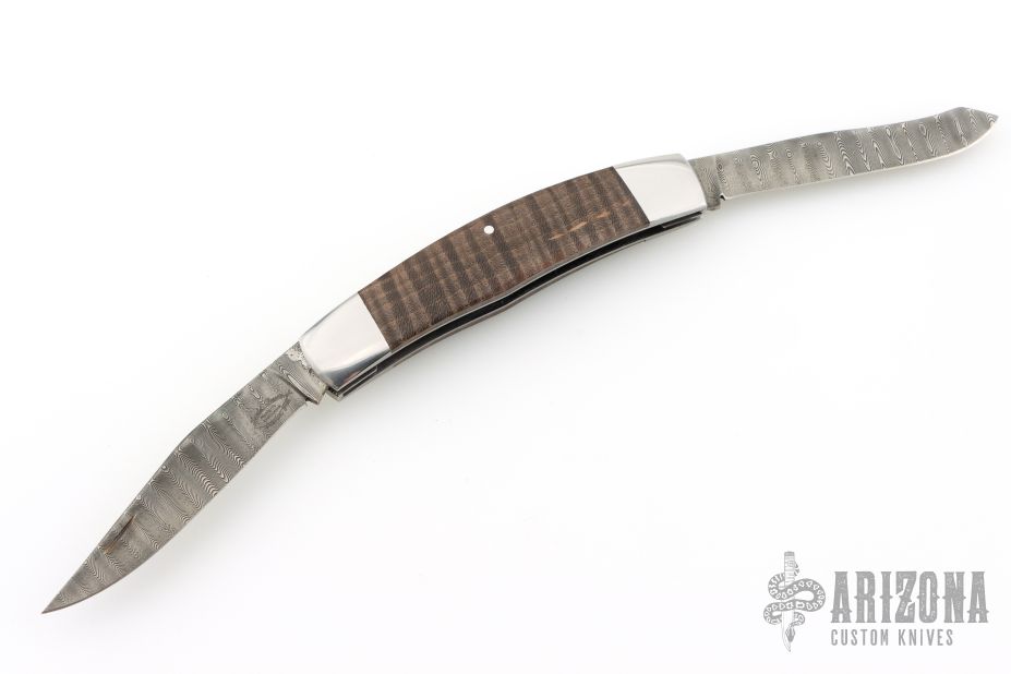 This slipjoint by Harold Brown features Damascus blades with nail nicks. The handle has stainless steel bolsters with integral fileworked liners, wood covers, and stainless steel springs. Comes with a zippered case. Excellent condition.