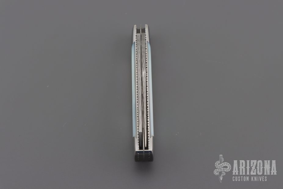 This slipjoint by Bill Simons features Damascus blades with nail nicks. The handle has stainless steel dovetailed bolsters, mother of pearl covers, fileworked stainless steel liners, and stainless steel springs. #242. Excellent condition. Comes with a zippered case.