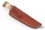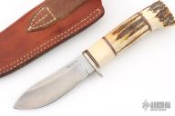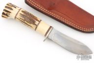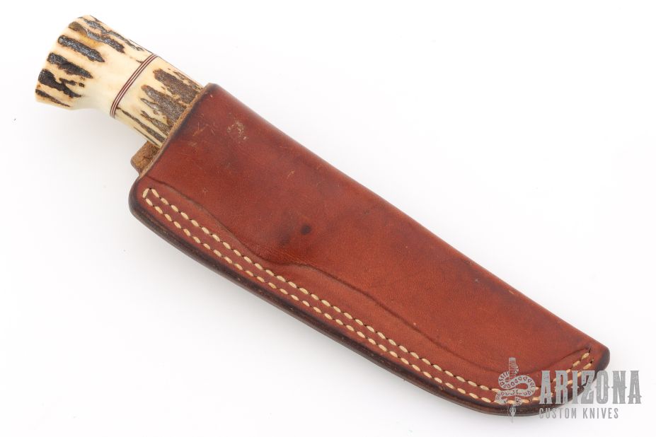 This Morseth Stag Skinner has a satin finished clip point blade with hidden tang, .178" blade stock and 1.120" blade depth. Handle is stag antler with a nickel silver guard and black, white and red spacers. Comes with a brown leather belt sheath. Has scuffs, scratches, and patina. Good condition for its age and otherwise.