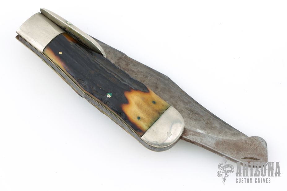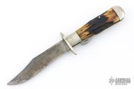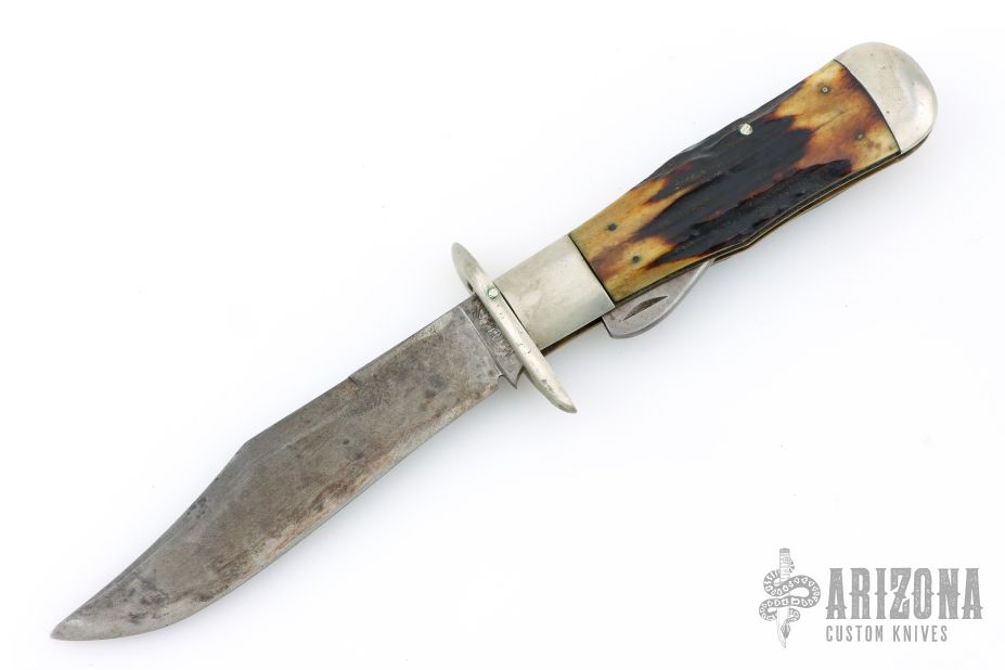 Unique design of the Marbles Safety knife makes this an intriguing piece. It has a satin finished blade, nickel silver swing guard and bolsters, brass liners and steel spring and blade cover. Pinned stag covers. Comes in an old leather belt sheath. Has scuffs, scratches, and patina. Good condition for its age and otherwise.