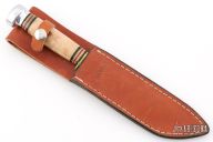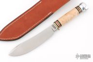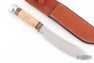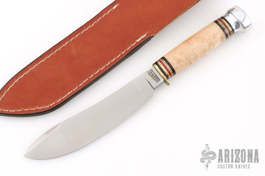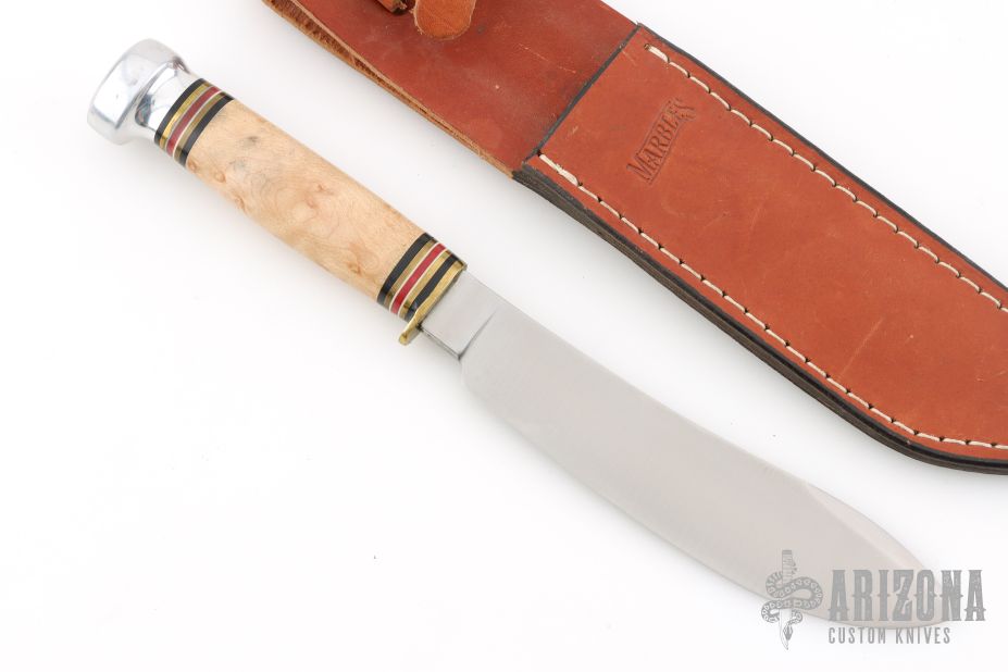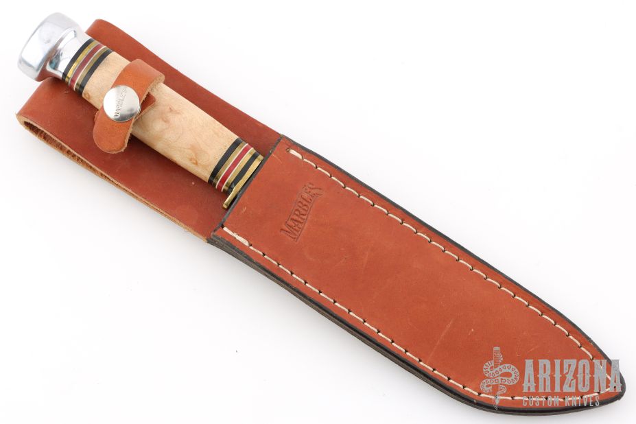 This knife by Marbles was made in Gladstone Michigan. It features a satin finished blade with false top edge, .212" blade stock, 1.294" blade depth, hidden tang construction. The handle has a brass guard, curly maple grip, aluminum pommel, black/brass/red/white spacers. Includes a Marbles brown leather sheath. Has some light scuffs and scratches, great overall condition.