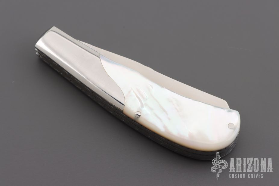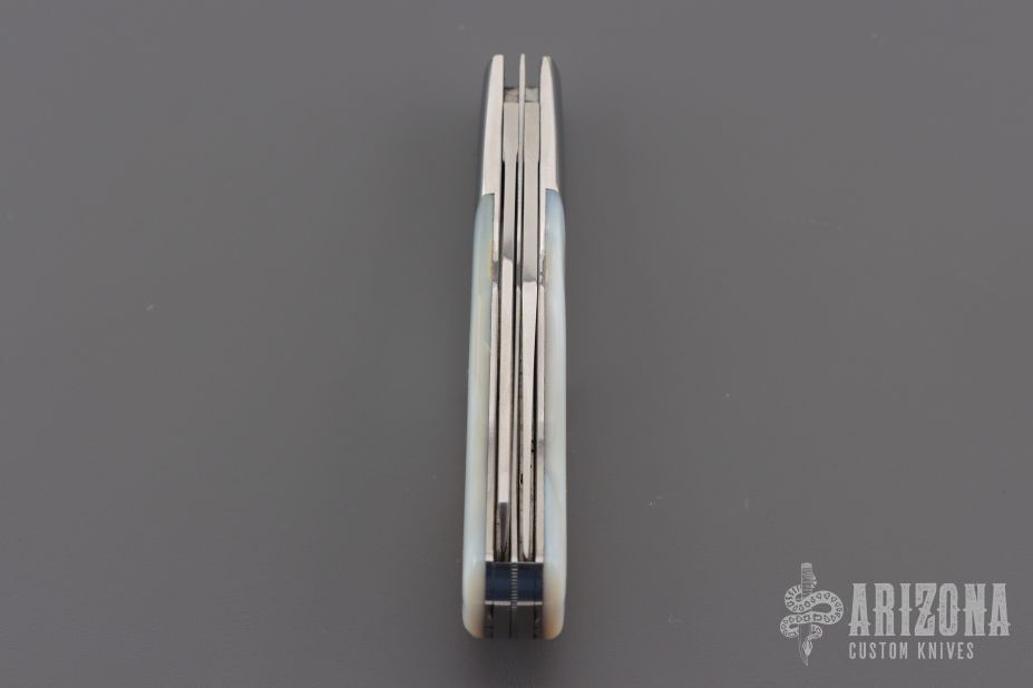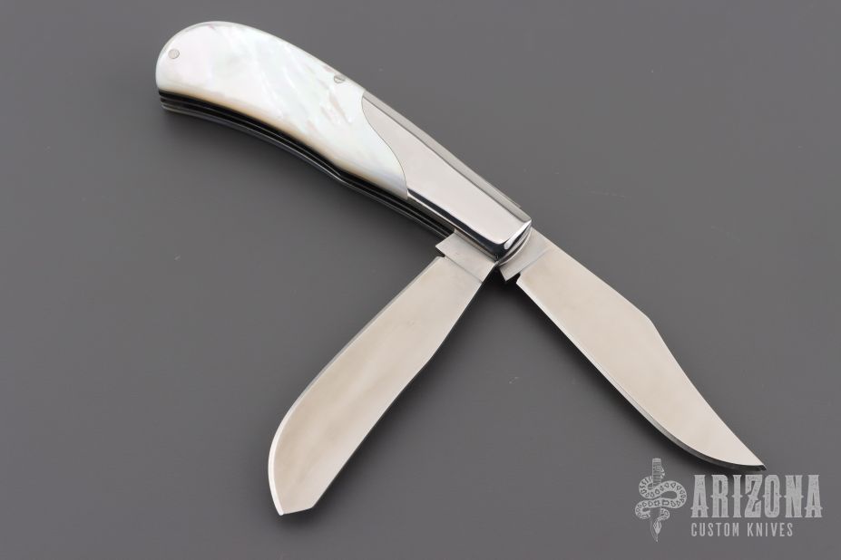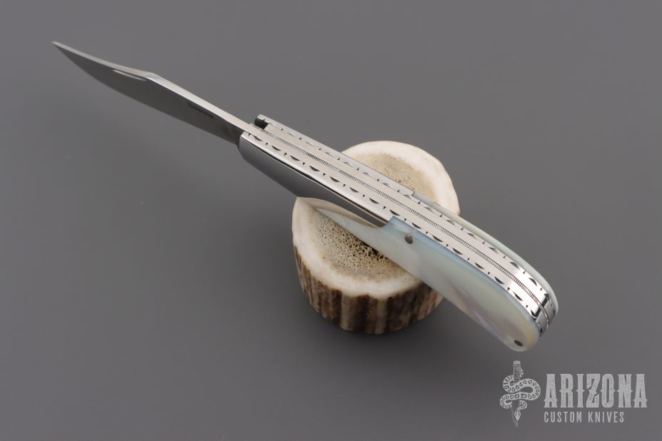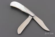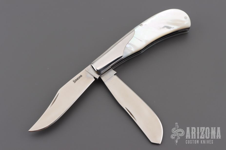 This slipjoint by Bill Simons features satin finished blades with nail nicks. The handle has mirror polished stainless steel bolsters, mother of pearl covers, fileworked stainless steel liners, and stainless steel spring. #311. Excellent condition. Comes with a zippered case.