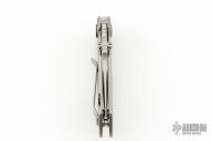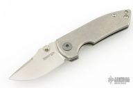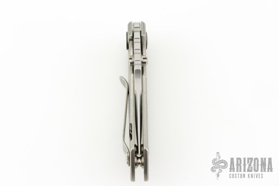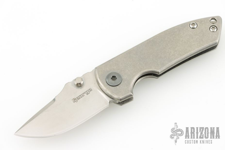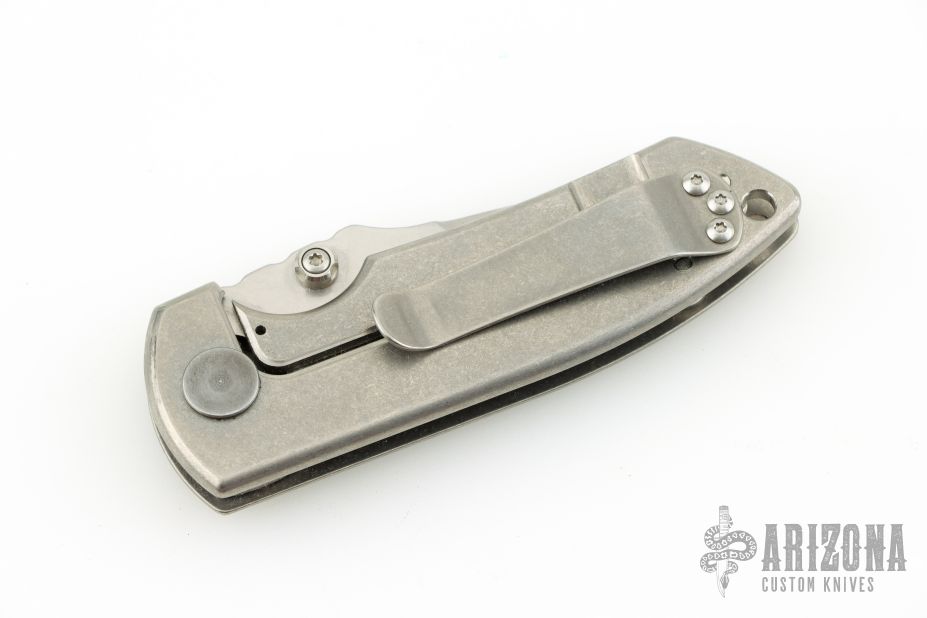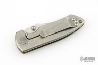 This ESV frame lock by Les George features a stonewashed blade, notched thumb rest and dual thumb studs. Stonewashed titanium frame and pocket clip for tip up carry. Smooth function with a good lock up, blade seating and nice detent. Has some scratches on the blade otherwise the knife is in Excellent condition.