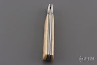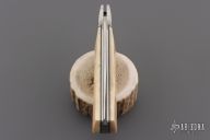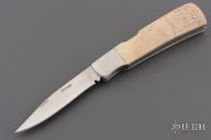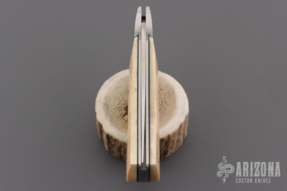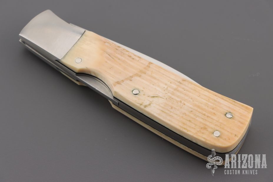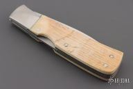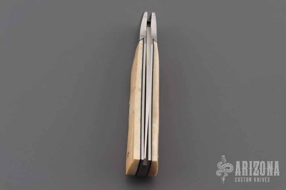 This lockback by Joe Prince features a satin finished blade with nail nick. The handle has dovetailed stainless steel bolsters, stainless steel liners, mammoth ivory scales with black liners, stainless steel backspacer. Nice blade seating and lockup. Excellent condition. Comes with a zippered case.