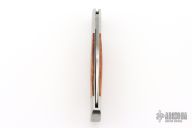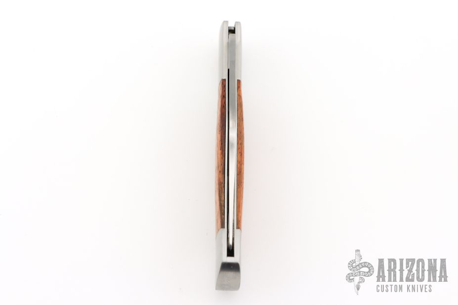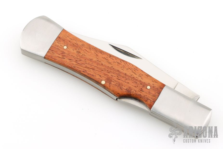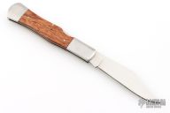 This lockback by "L" (the makers mark is a cursive capital L, please let us know if you know who this is) features a mirror polished blade with nail nick. The handle has stainless steel bolsters and liners, wood scales, stainless steel backspacer. Has a couple light scratches, otherwise excellent condition.