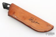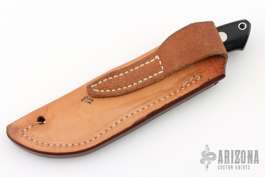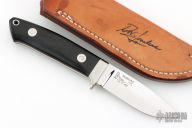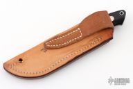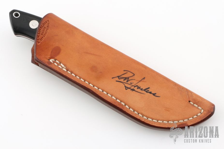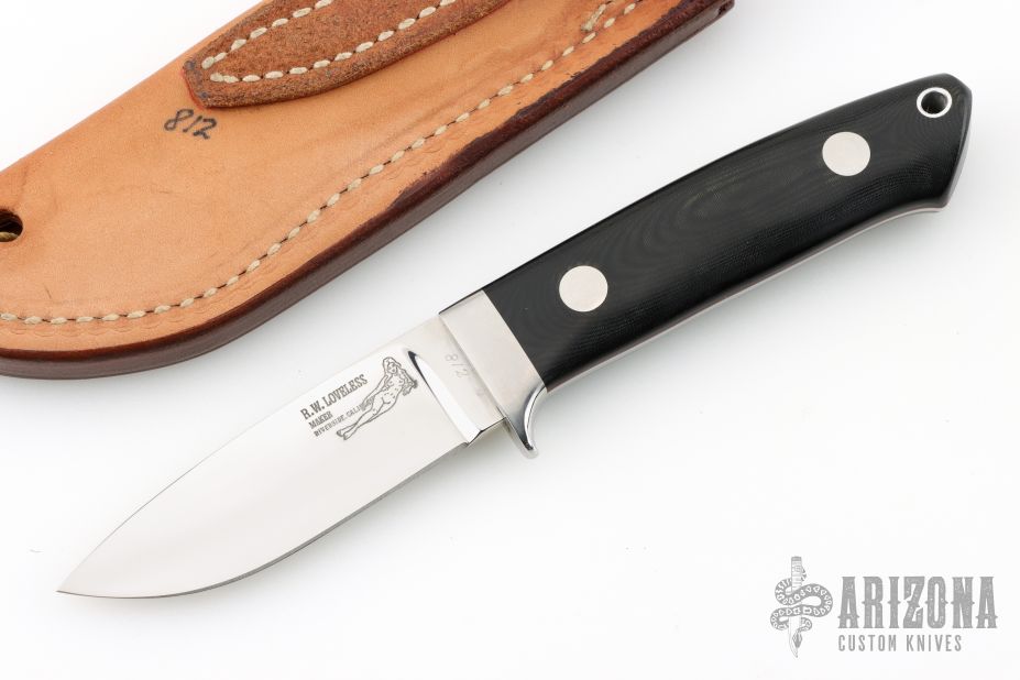 The 3.5" Drop Point Hunter that made Bob Loveless designs so famous. Mirror finished drop point blade with the "R.W. Loveless maker Riverside, Calif." Double Nude logo. Full tapered tang construction. .161" Blade Stock .958" Blade Depth. The handle has a stainless steel guard and black linen micarta scales with red liners, lanyard hole. #812. Comes with matching numbered leather sheath with Loveless stamp. Has a few extremely light scratches, otherwise excellent condition.