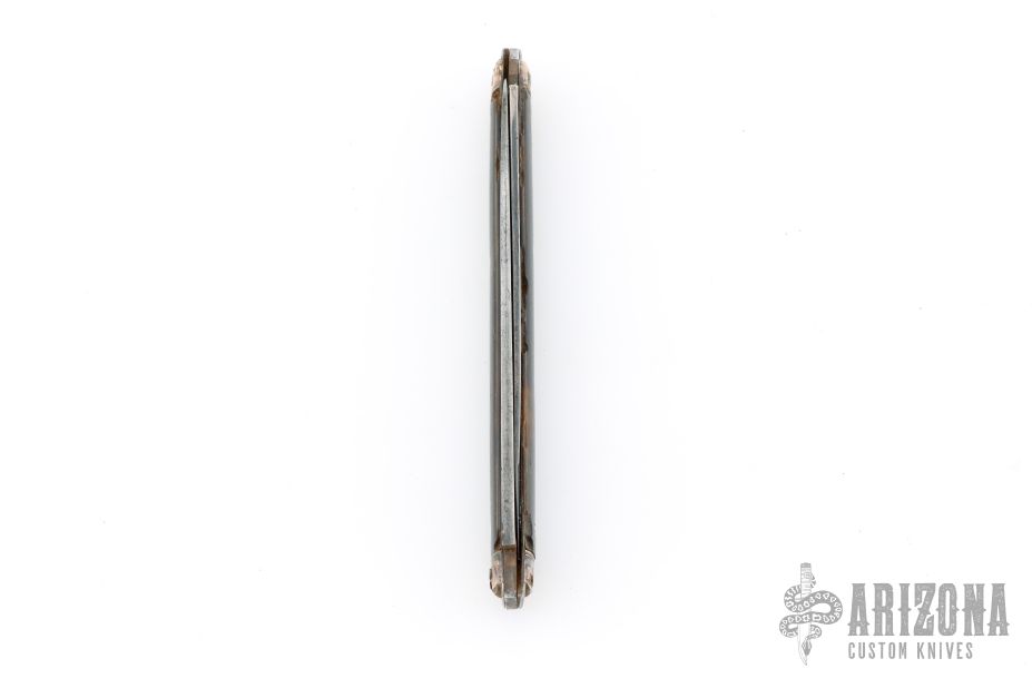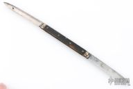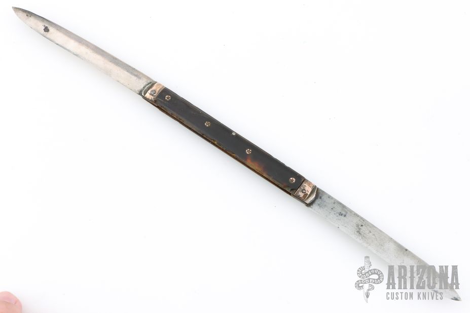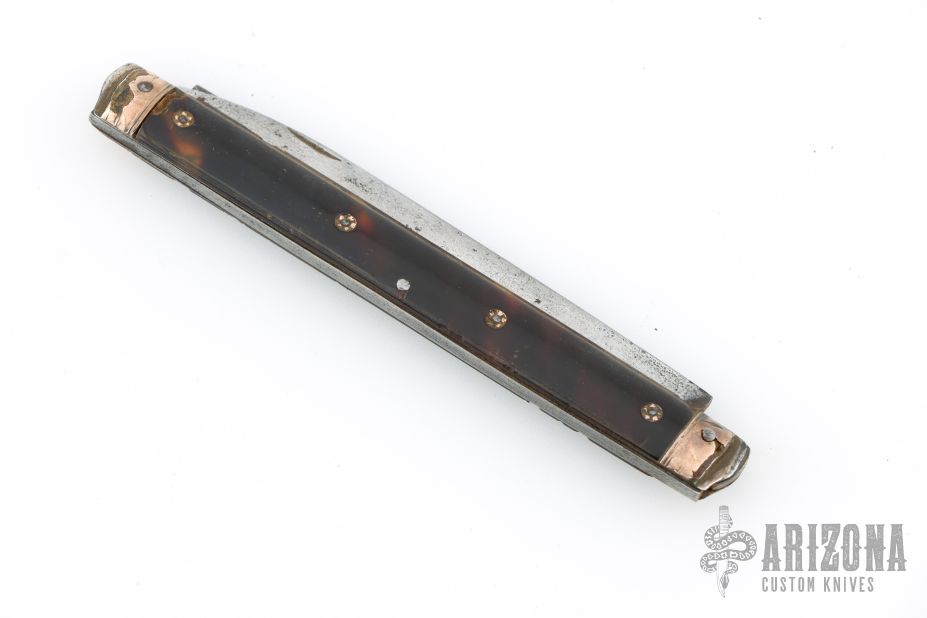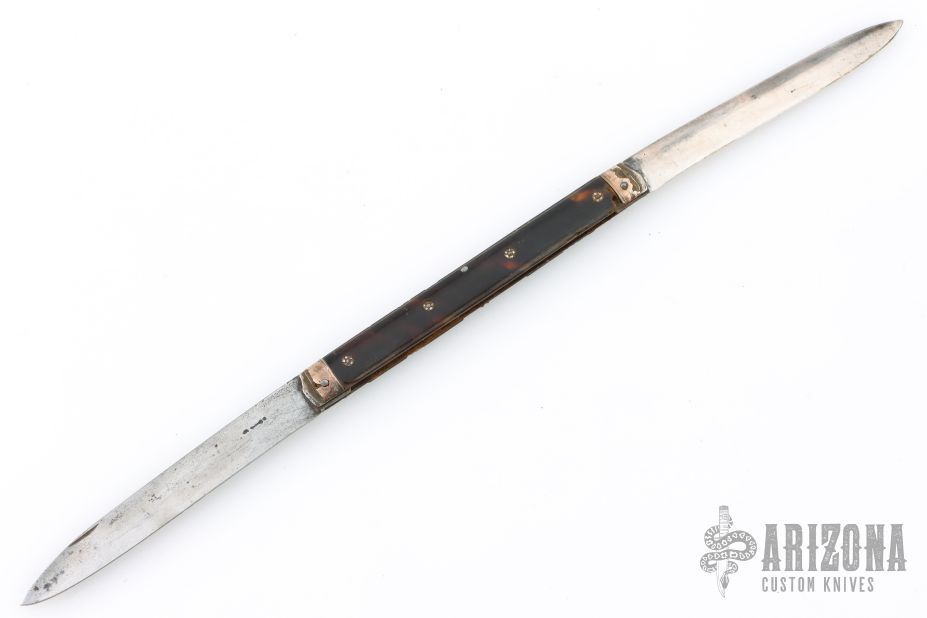 This Antique fruit knife features two drop point blades with nail nicks. One blade is steel, and the other is silver. The bolsters are a rose color, and are probably silver as well as the liners. The handle has pinned shell covers. This knife is probably 100+ years old. Comes with a snap sheath. Has scuffs, scratches, and patina. Good condition for its age and otherwise.