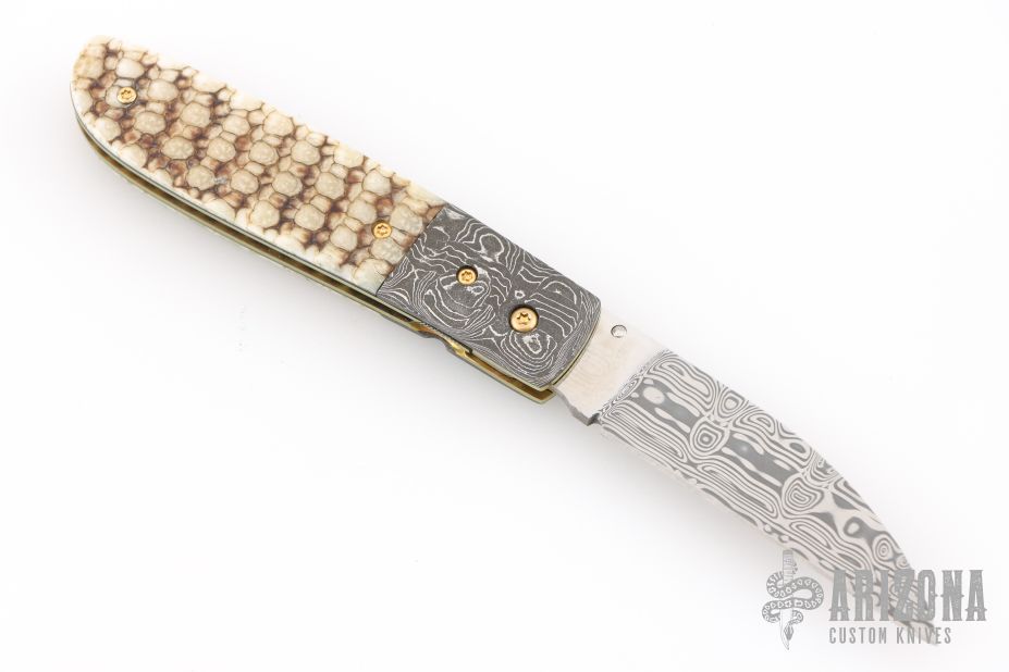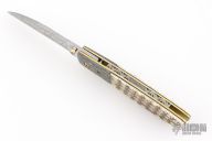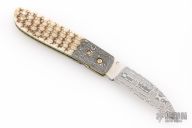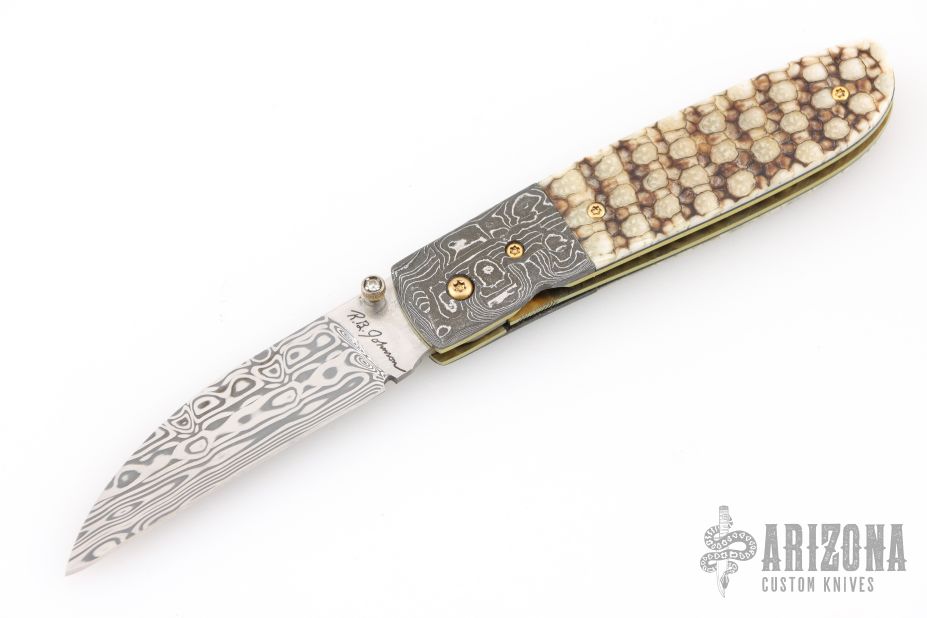 This linerlock folder by RB Johnson features a Damasteel blade with a single thumbstud with a diamond inlay. The handle has Damascus bolsters, armadillo hide scales with black liners, anodized titanium liners, 24k gold plated screws and a fileworked stainless steel backspacer. Nice detent, lockup and black seating. Very nice work. Comes with a zippered case. Excellent condition.