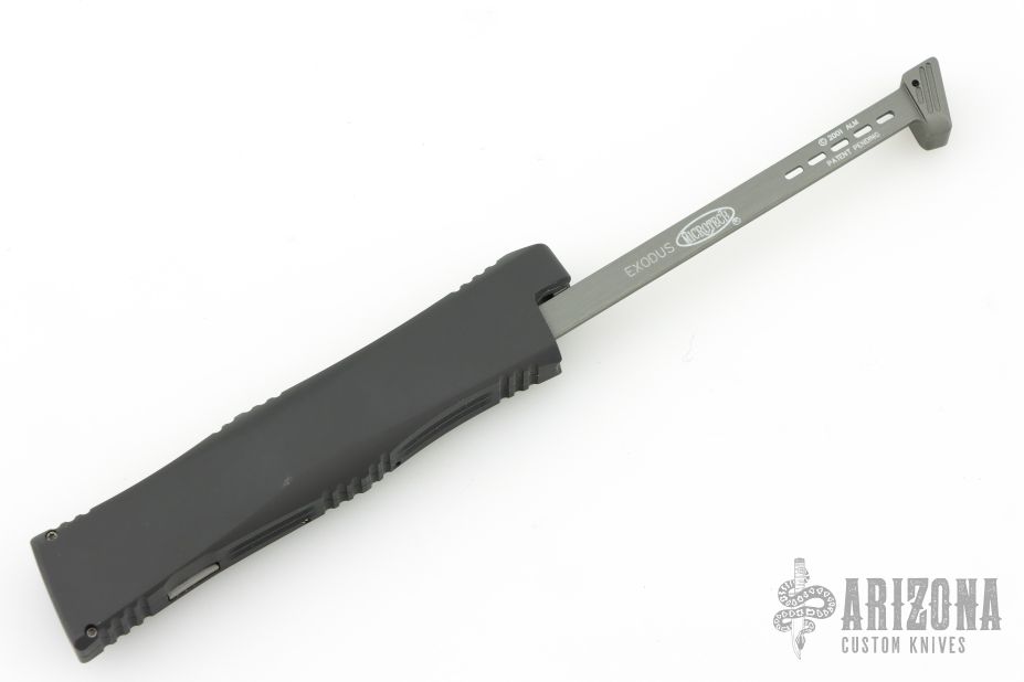 This Exodus by Microtech opens out the front via the automatic push button. Closes by disengaging the leaf lock and pulling the reverse charging handle in the rear of the frame. Contoured frame grip with milled ribbing on the frame spine and belly. This Exodus features a black tanto blade. Dated 07/2001.  Comes with original box, papers, and MT nylon belt sheath. Has a couple light scuffs, excellent condition otherwise.