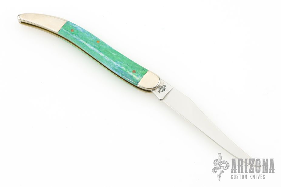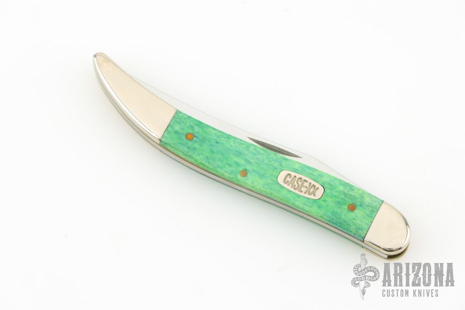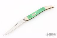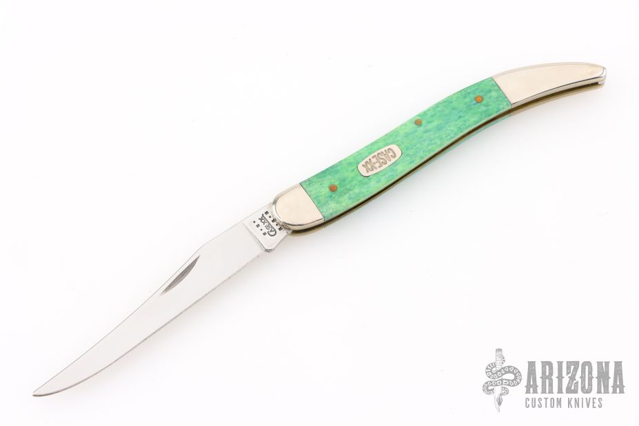 This Toothpick by Case Knives features mirror finished blade with nail nick. The handle has nickel silver bolsters, blue/green bone covers, brass liners, and a stainless spring. Comes with original box and papers. Excellent condition.