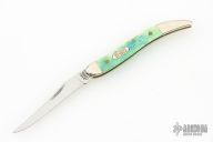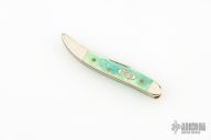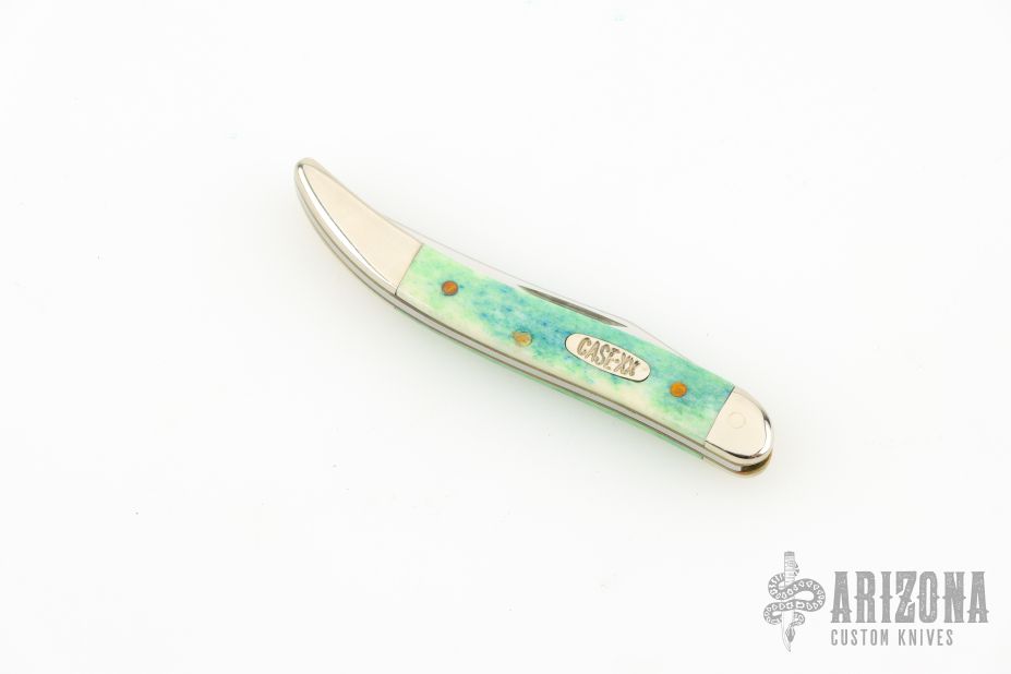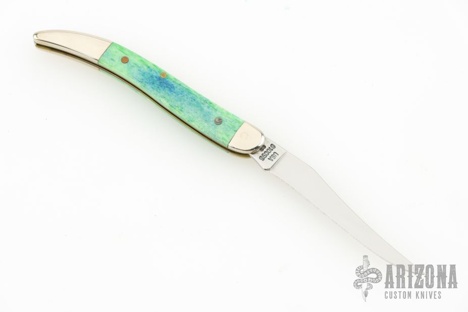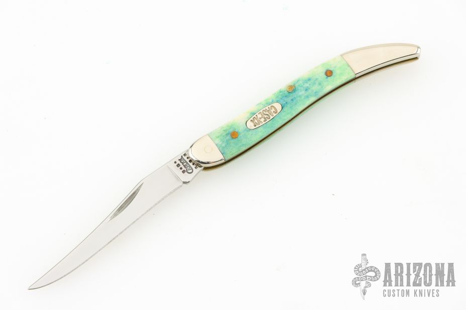 This Toothpick by Case Knives features mirror finished blade with nail nick. The handle has nickel silver bolsters, blue/green bone covers, brass liners, and a stainless spring. Comes with original box and papers. Excellent condition.