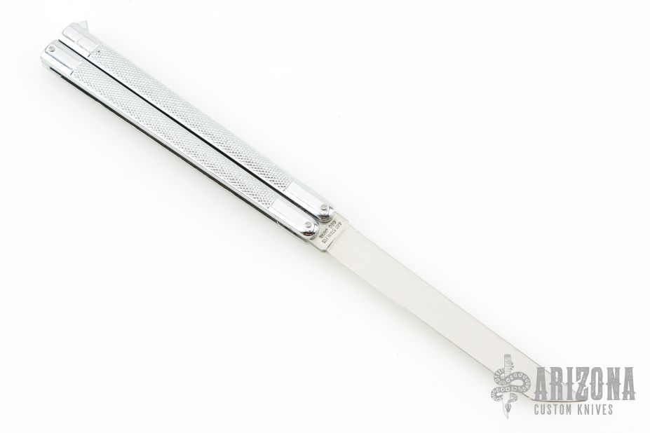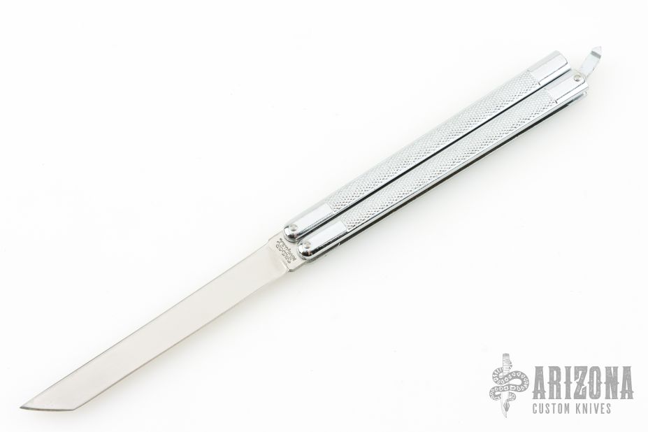 This Harakiri Balisong by Valor has a satin finished blade. Nonferrous "Diecast Metal" channel construction handles with aluminum T-latch. Has some light scratches, great overall condition for its age and otherwise.