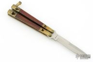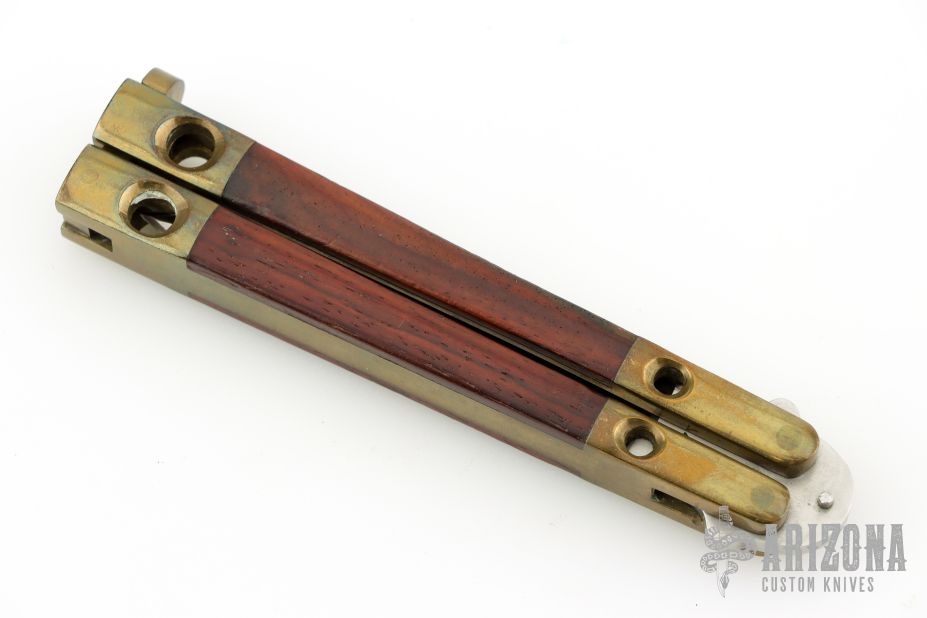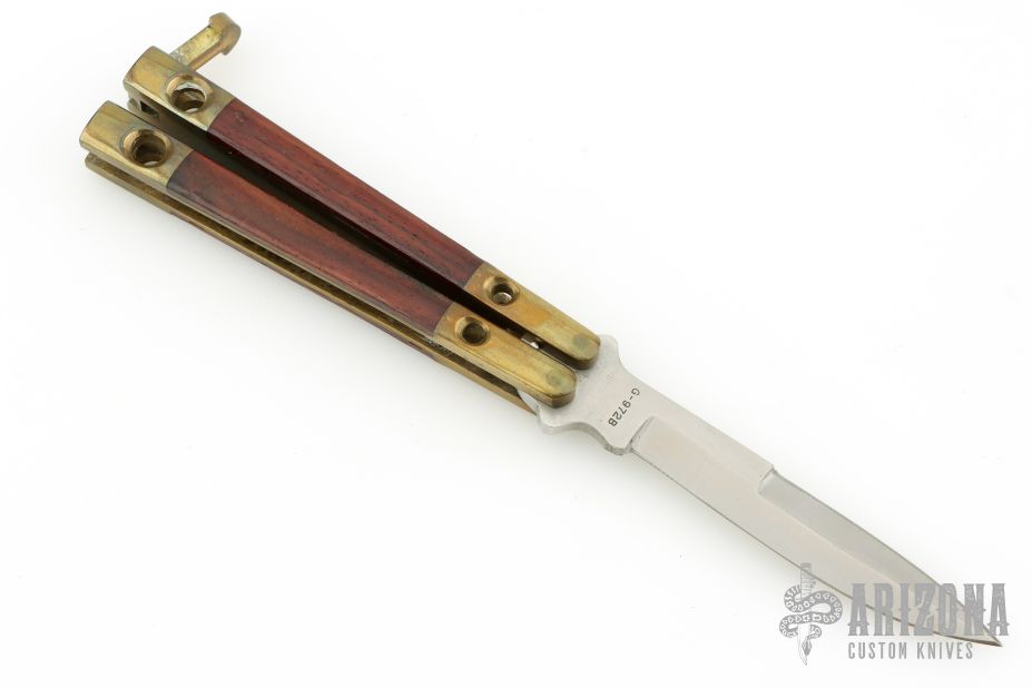 This Manilla Folder Balisong from Taylor/Seto features a satin finished spear point blade with a false top edge. The handle has an integral brass construction with rosewood inlays. Batangus style T latch on pommel. Has some patina and scratches, otherwise great condition.