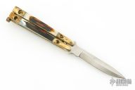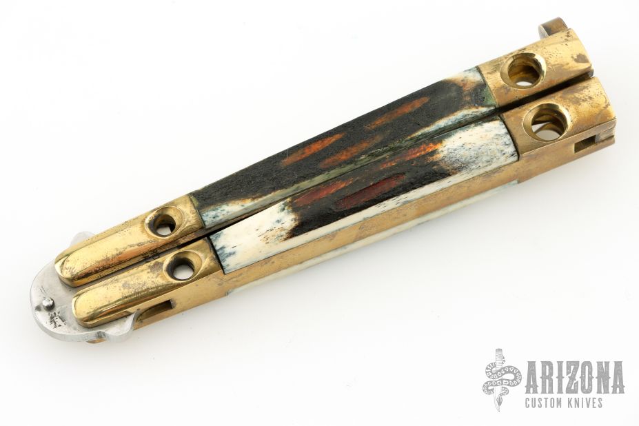 This Manilla Folder Balisong from Taylor/Seto features a satin finished spear point blade with a sharpened top edge. The handle has an integral brass construction with stag jigged bone inlays. T latch on pommel. Has some scratches and patina, otherwise great condition.
