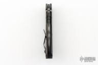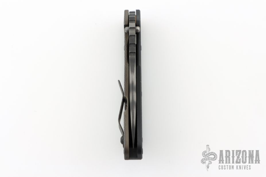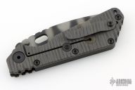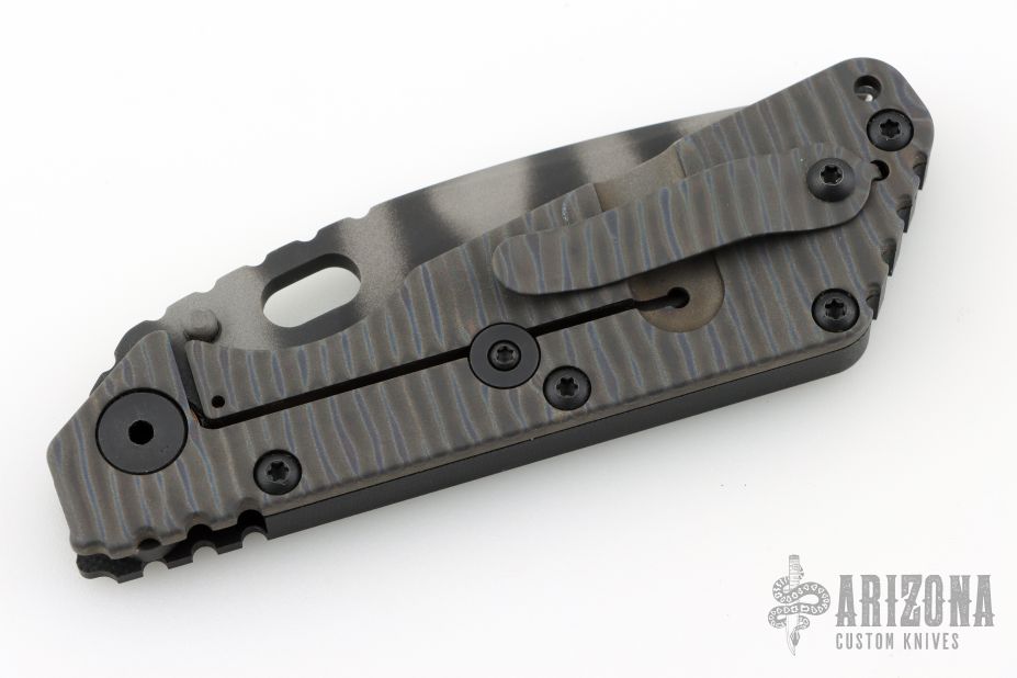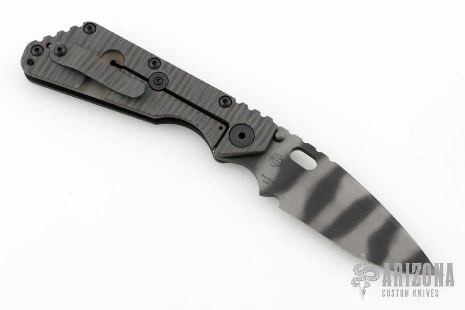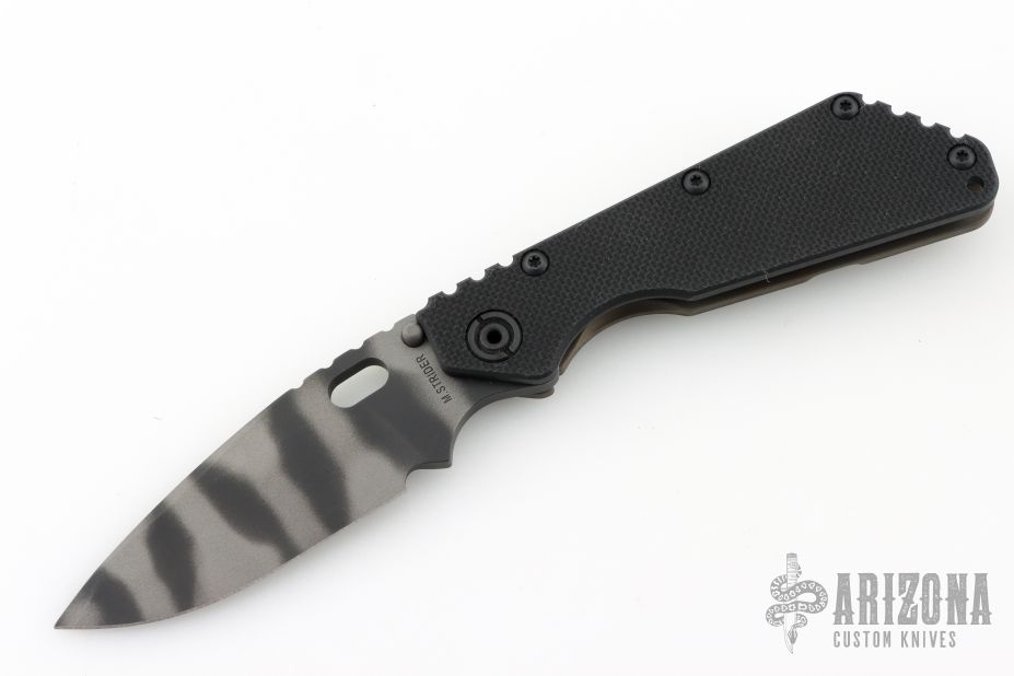 This SMF from Strider Knives features a tiger stripe blade and textured black G-10 and flamed titanium handle and matching tip up titanium clip. Notches on thumbrest, rear of handle, and lockup. Includes Hinderer "Lock Bar Stabilizer" for maximum reverse lock retention. Excellent condition.