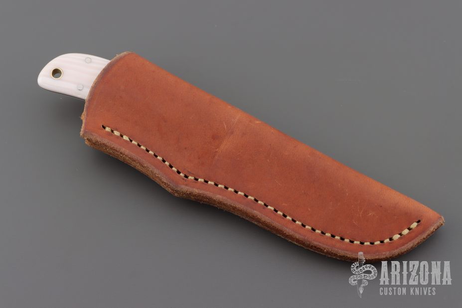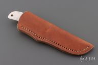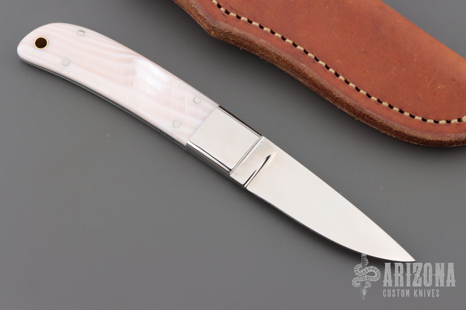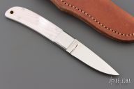 This Knife by Steve R Johnson features a mirror finished blade with .121" blade stock and .722" blade depth, full tapered tang construction. The handle has stainless steel bolsters, Freshwater Pink Pearl scales with stainless steel pins and lanyard hole. Comes with a brown leather sheath and zippered case. Excellent condition.