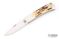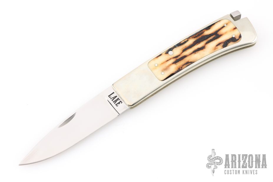 This Tail Lock by Ron Lake features mirror finished blade with nail nick. The handle has a nickel silver frame with stag inlays, stainless steel tail lock, nickel silver backspacer at the butt. Comes with a zippered case. Perfect lockup and blade seating. Excellent condition.