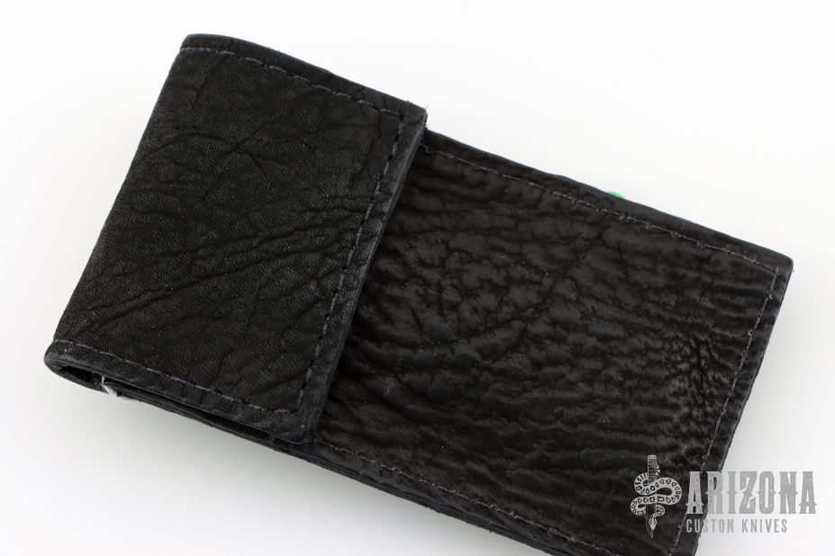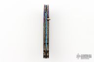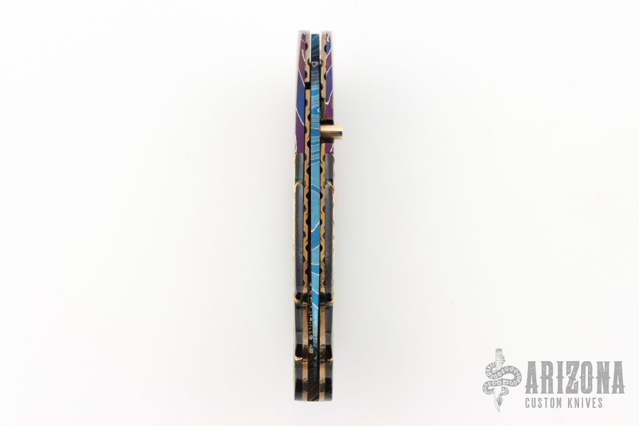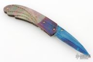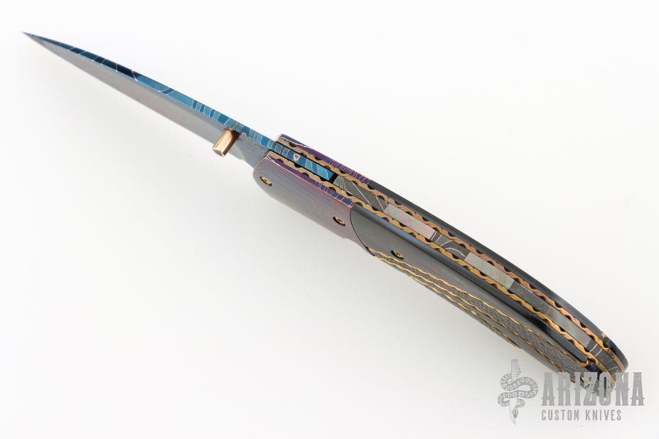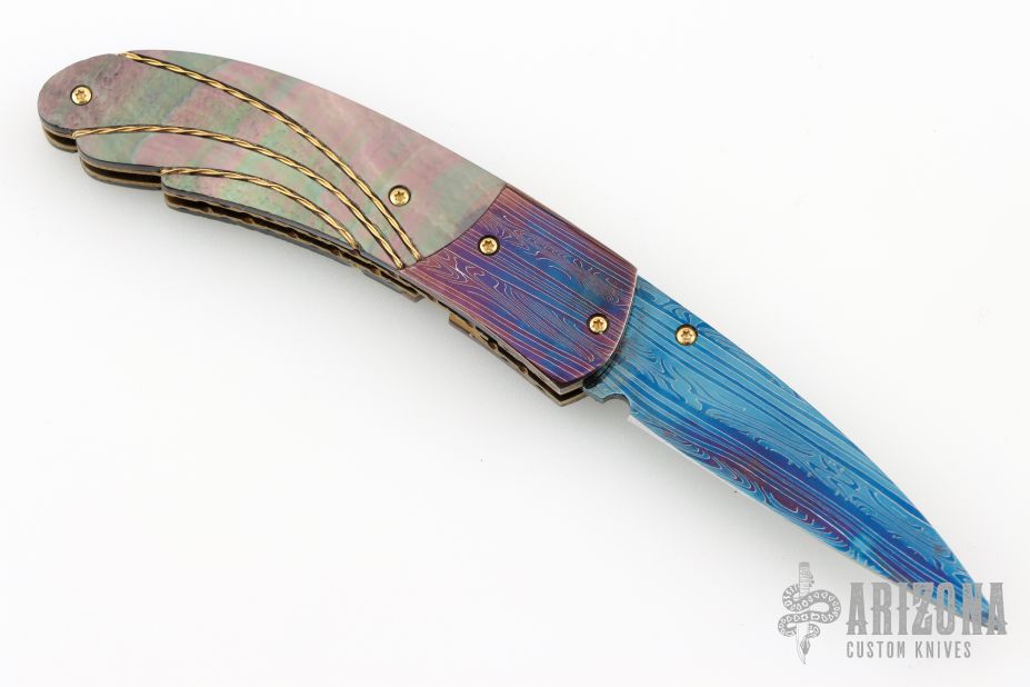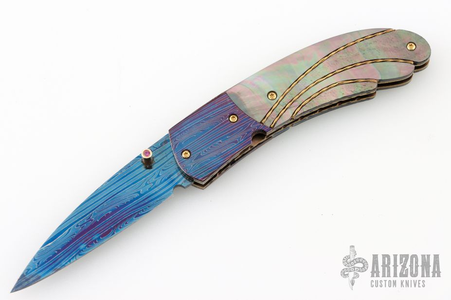 This knife by Mike Zscherny features a blued Damascus blade with a single gold thumbstud with red stone inlay. The handle has matching blued Damascus bolsters, carved black lip pearl scales with twisted gold wire inlays, fileworked and anodized titanium liners, Damascus backspacer with black lip pearl inlays. Nice lockup, detent and blade seating. Comes with a leather Velcro case. Excellent Condition.