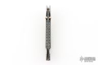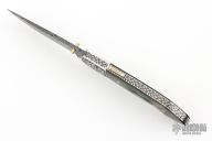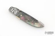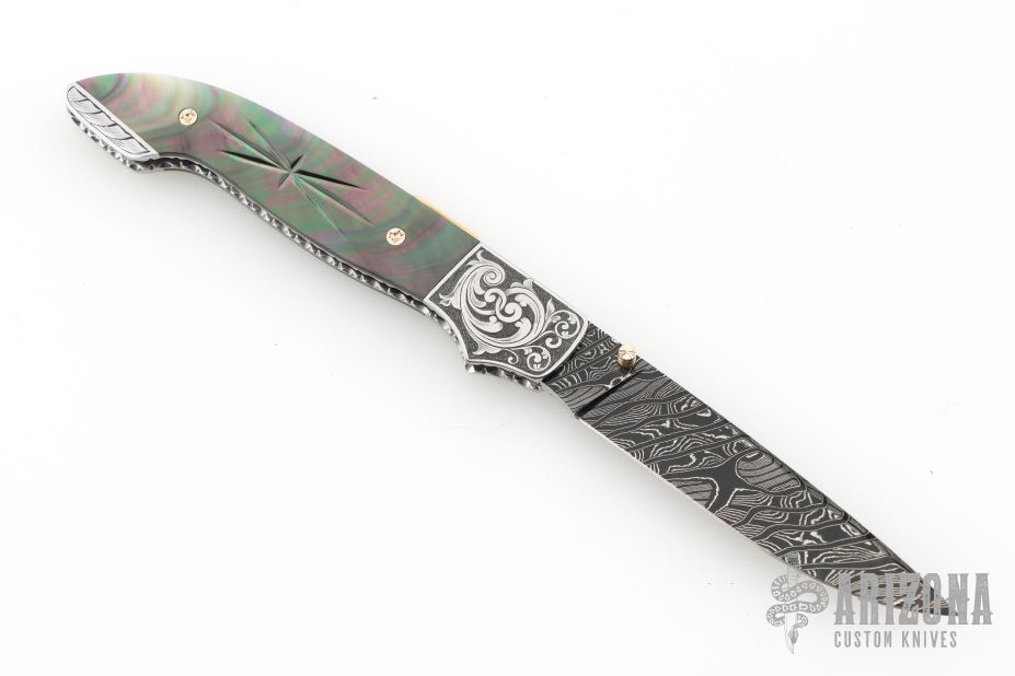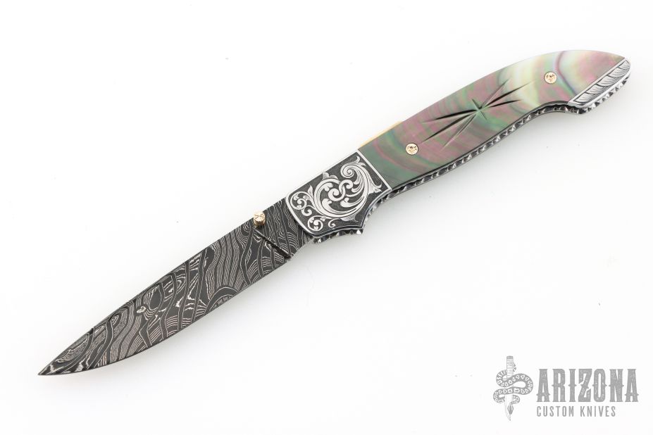 This Lockback folder by Larry Newton features a Damascus blade with dual engraved gold thumbstuds. The handle has engraved stainless steel bolsters with integral fileworked liners, carved black lip pearl scales, engraved gold screws, engraved stainless steel backspacer with engraved gold lock release. Excellent condition.