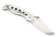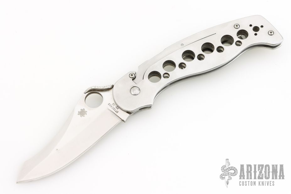 This C70P ATR by Spyderco Knives features a satin finished spearpoint blade with thumbhole and notched thumbrest. The handle is satin finished steel and has a top framelock. Right or Left tip up stainless steel clip. Has some scuffs and scratches, great condition otherwise.