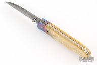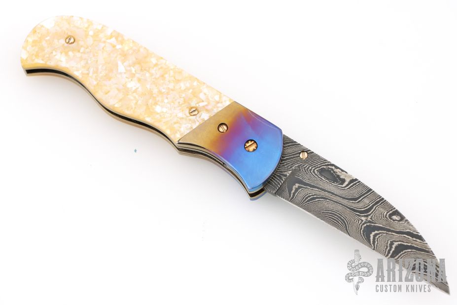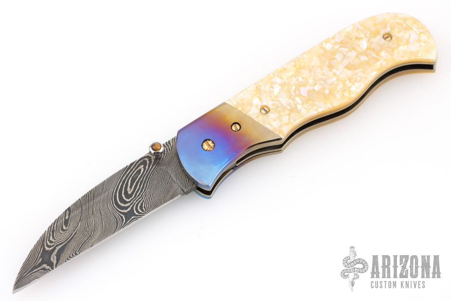 This linerlock by Dan Chinnock features a Damascus blade with single thumbstud with tigereye inlay. The handle has anodized titanium bolsters, crushed/stabilized gold lip pearl scales, gold plated screws, fileworked and anodized titanium liners and backspacer. Nice lockup, detent, and seating. Comes with a zippered case. Excellent condition.