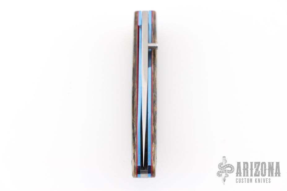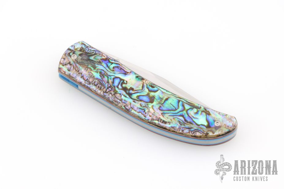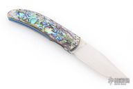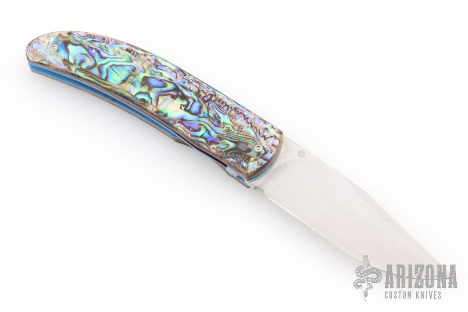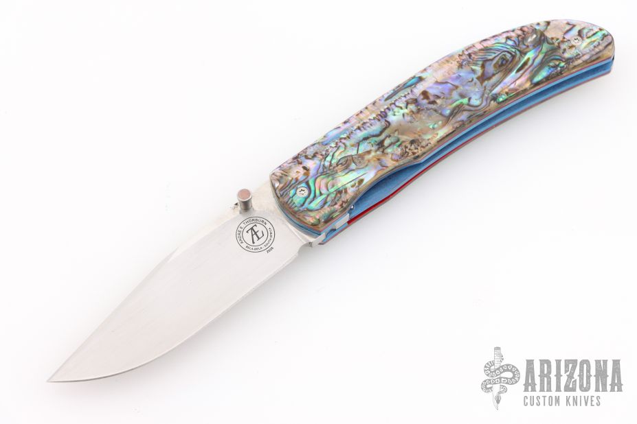 This linerlock folder by Andre Thorburn features a hand rub satin finished blade with single thumbstud with pearl inlay. The handle has abalone scales, anodized titanium liners, stainless steel backspacer. Smooth action with a nice detent, lockup and blade seating. Comes with a zippered case. Has a couple very light scratches, otherwise excellent condition.  Dated 2008