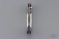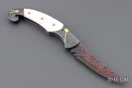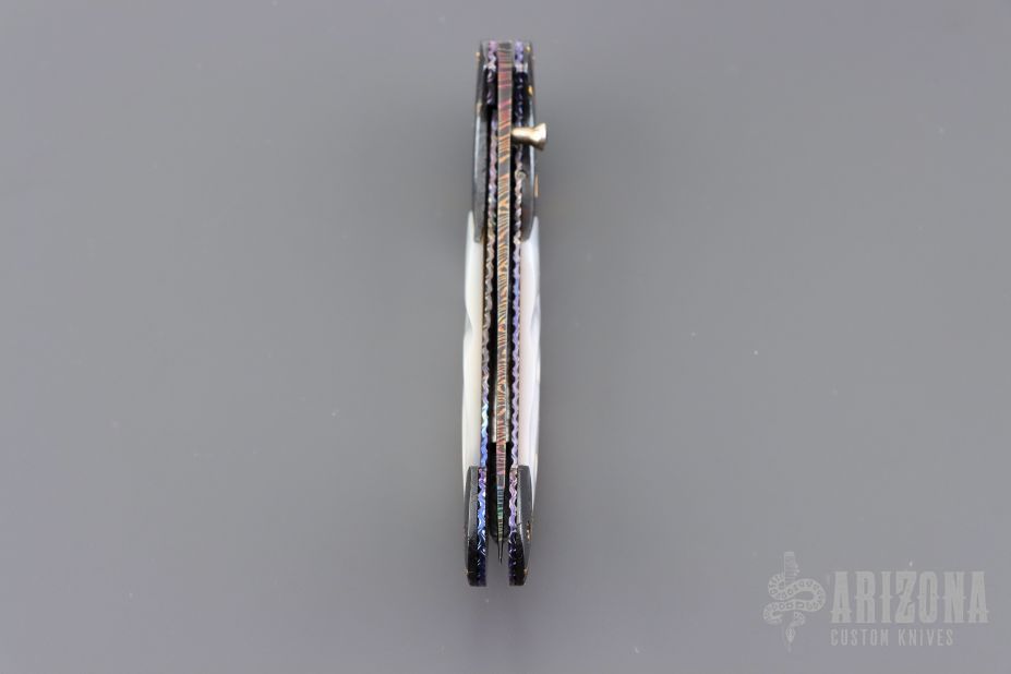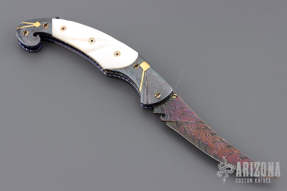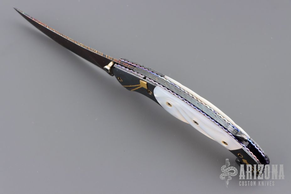 This sole authorship D/A automatic features a Damascus blade with single thumbstud with sapphire inlay. The handle has Damascus bolsters with gold inlaid engraving, gold square push button, carved mother of pearl scales, fileworked and anodized titanium liners, Damascus backspacer. Nice action, detent, lockup and blade seating. Comes with a zippered case. Excellent condition.