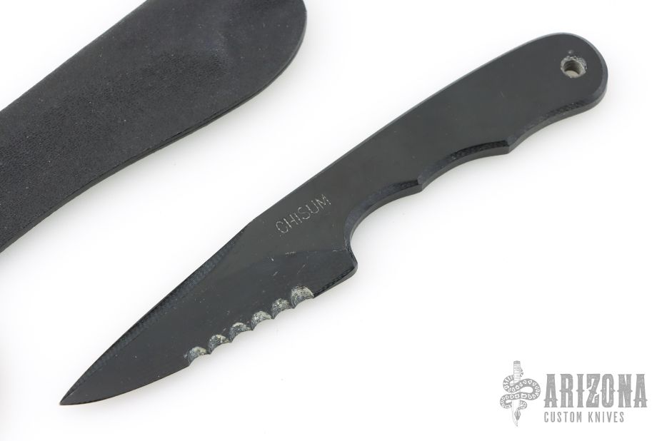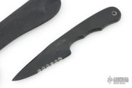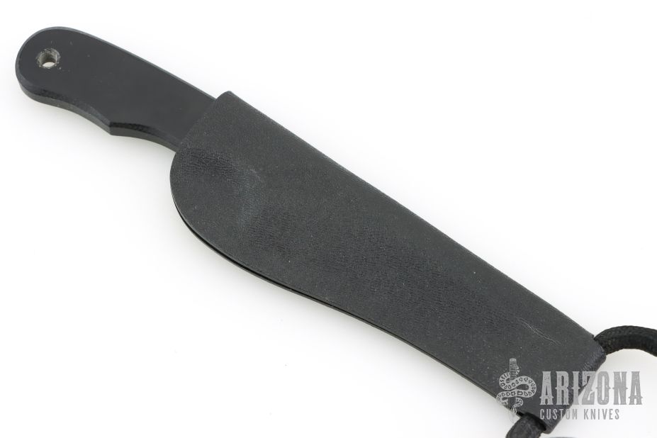 This Neck Knife by Michael Chisum is all-G10 constructed, with a serrated spear point blade. Comes with kydex sheath with paracord (no metal fasteners). Has some scratches, great overall condition.