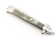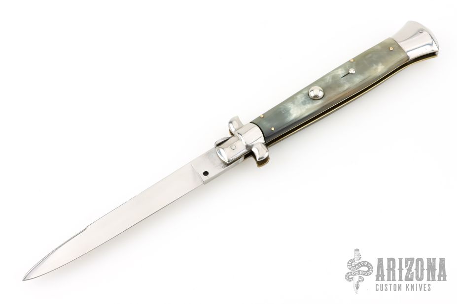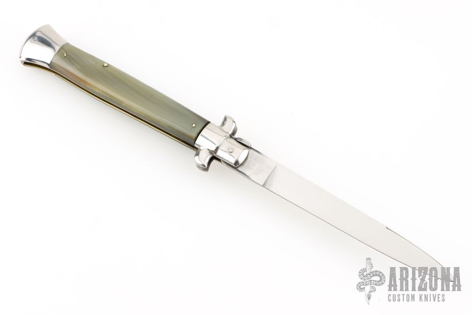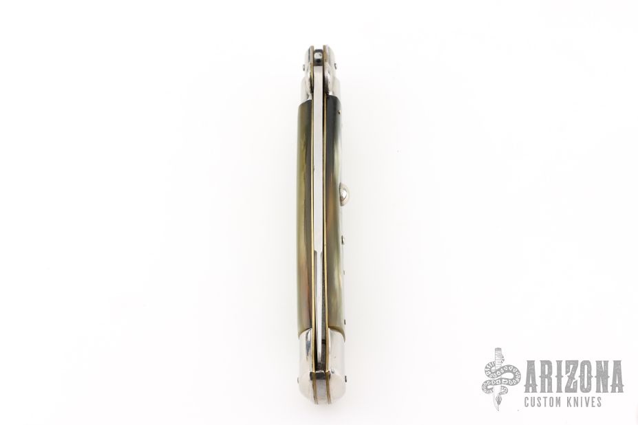 This 15" Swivel Bolster features a satin finished blade. The handle is comprised of stainless steel guard and bolsters, honey horn scales over brass d-stamp liners and stainless steel backspacer. Has some scratches and and dings, otherwise good condition. Comes with a zippered case.