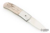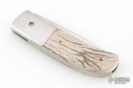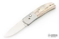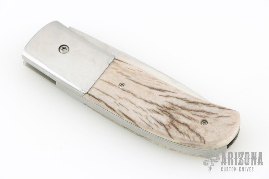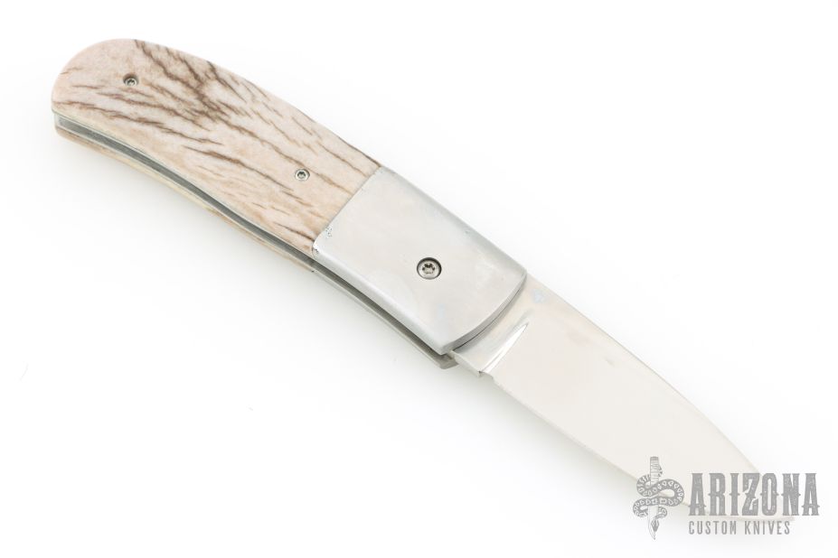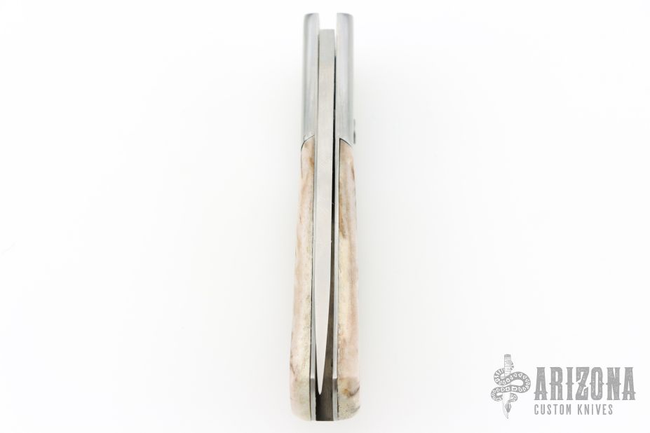 This side opening automatic by Zolan McCarty has a mirror polished blade. The handle has satin finished and dovetailed stainless steel bolsters, giraffe bone scales, titanium liners and a stainless steel backspacer. Has a few light scratches, otherwise excellent condition. Comes with a zippered case.