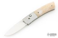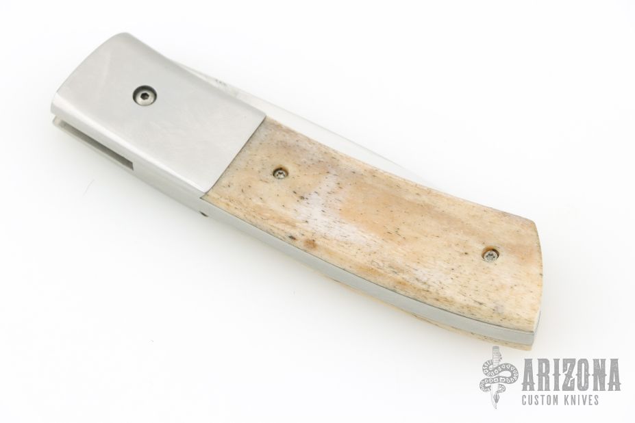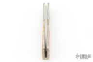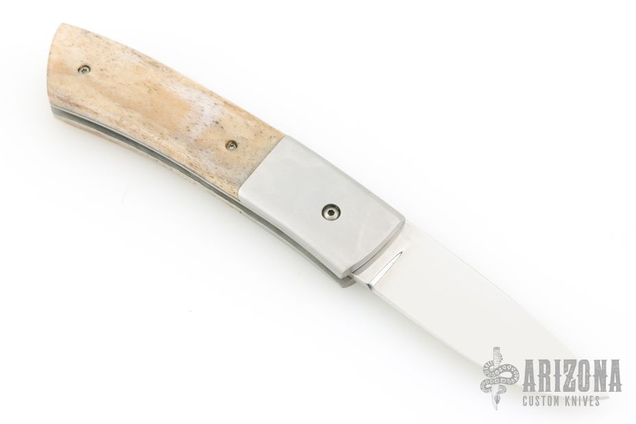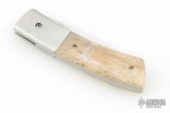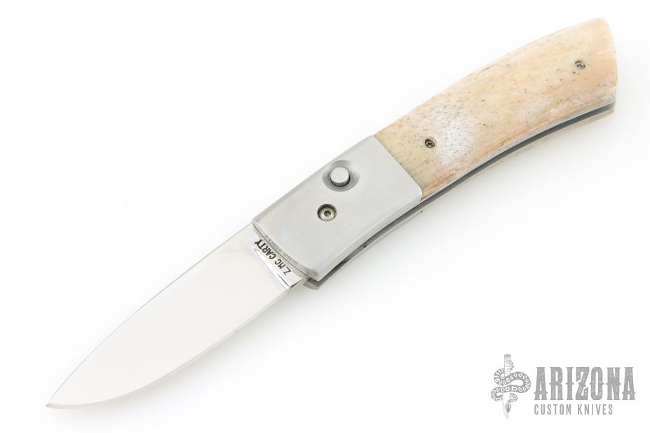 This side opening automatic by Zolan McCarty has a mirror polished blade. The handle has satin finished and dovetailed stainless steel bolsters, giraffe bone scales, titanium liners and a stainless steel backspacer. Has a few light scratches, otherwise excellent condition. Comes with a zippered case.