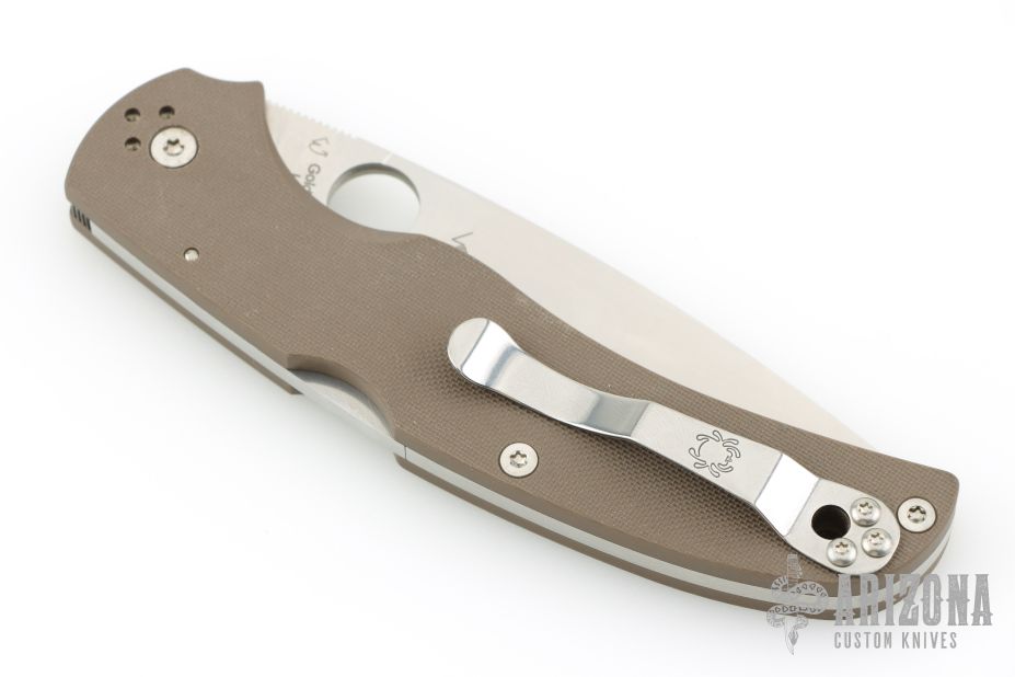 This Native Chief by Spyderco features a satin blade, brown G-10 scales, black stainless steel backspacer and 4-way reversible clip. Comes with original box and papers. New condition.