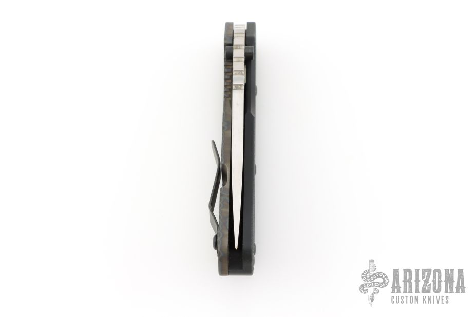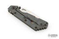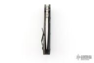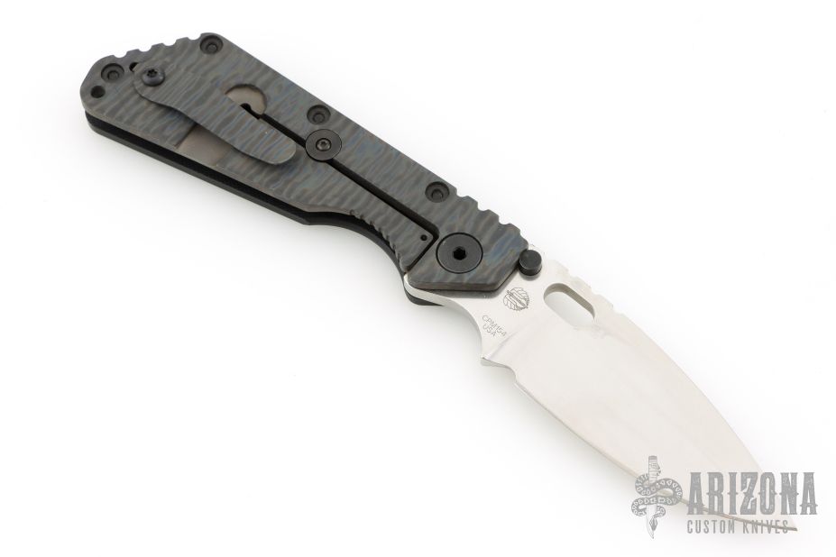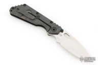 This SMF from Strider Knives features a stonewashed blade and textured black G-10 and flamed titanium handle and matching tip up titanium clip. Notches on thumbrest, rear of handle, and lockup. Excellent condition.