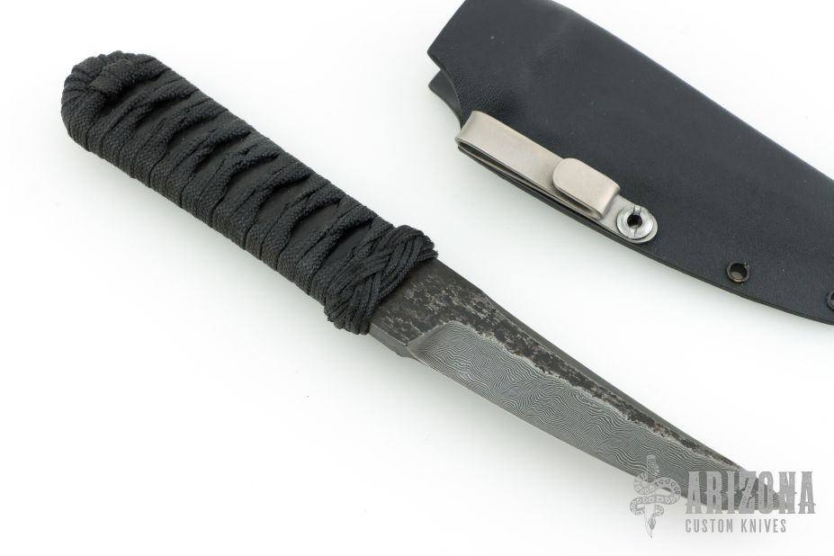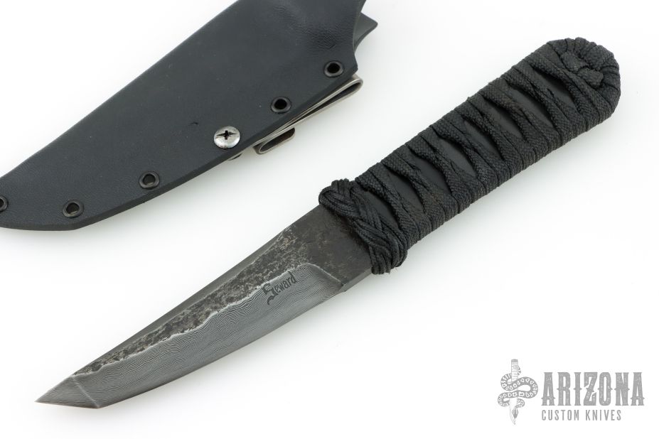 This Kwaiken from Ben Seward features a Damascus tanto blade with forge finished flats and a false top edge, .221" Blade stock 1.187" Blade Depth. The handle has a black tsuka ito wrap over black G-10. Includes a kydex sheath. Excellent condition.
