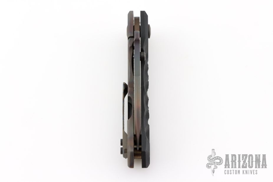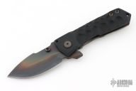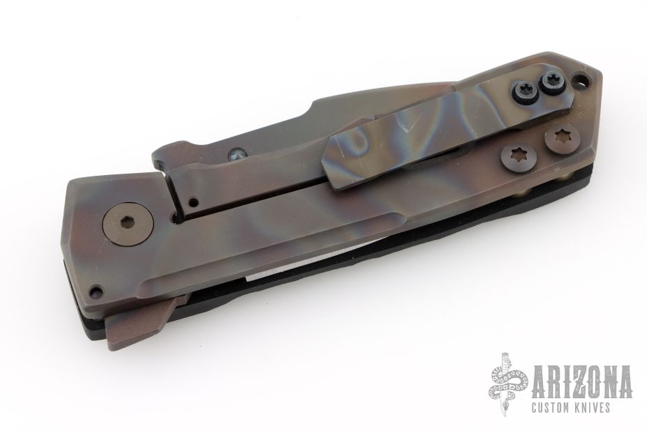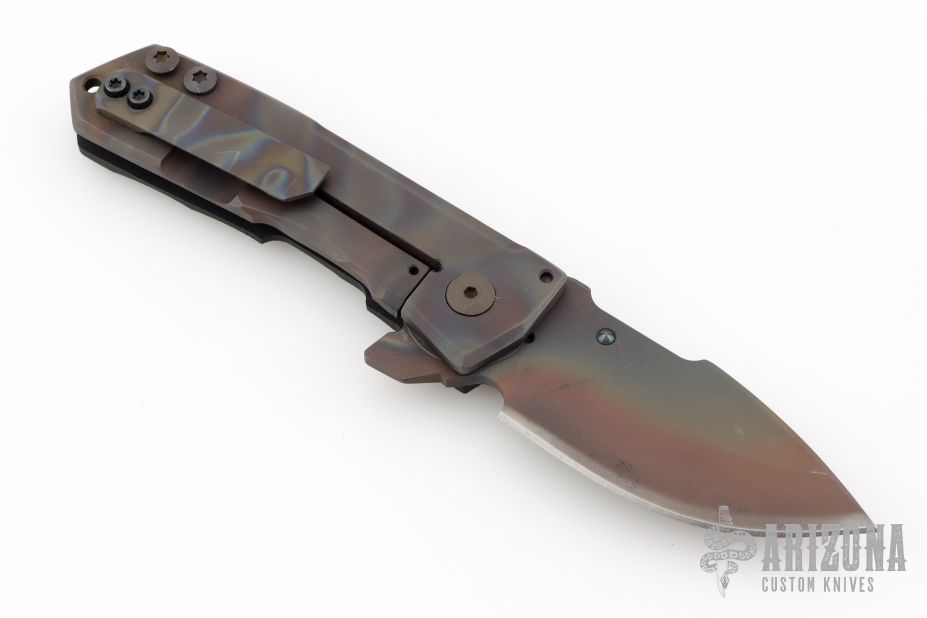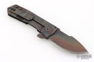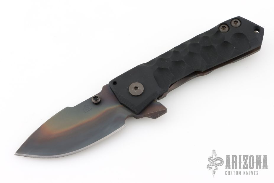 This FIFP (Fear is For Prey) framelock flipper by Crusader Forge features a phantom finished drop point blade with flipper.  The handle features a black G-10 and flamed titanium frame with with matching tip up pocket clip. Has some light scuffs and a couple small spots on the blade, otherwise excellent condition.