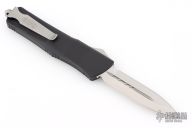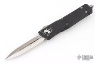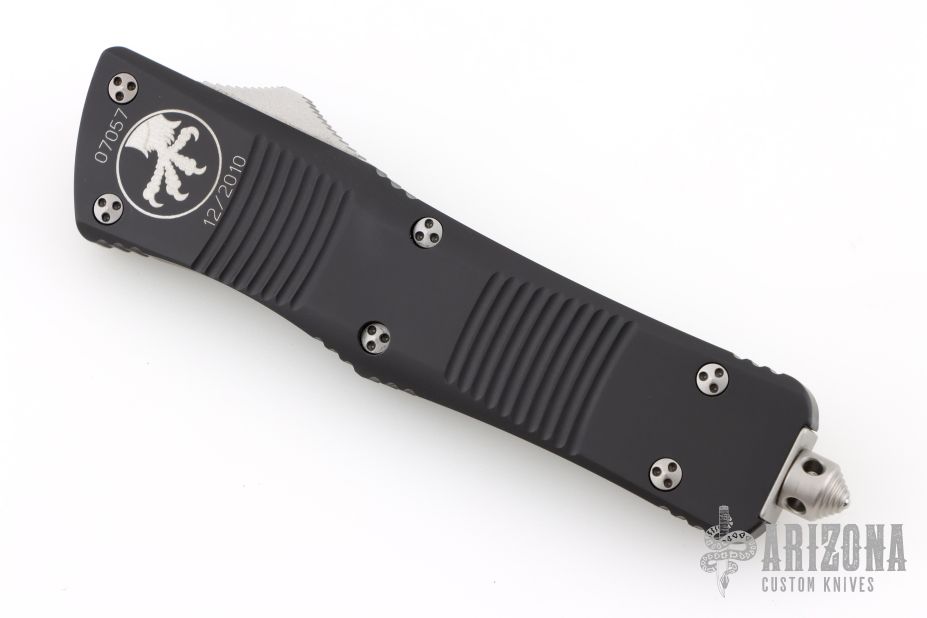 This Combat Troodon OTF automatic features a satin finished D/E blade with a standard edge. Black aluminum handle with a tip down blasted stainless steel clip. Glass breaker. Serial number 07057 and dated 12/2010. Comes with a nylon belt sheath. Has a couple light scuffs, otherwise excellent condition.