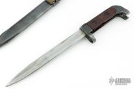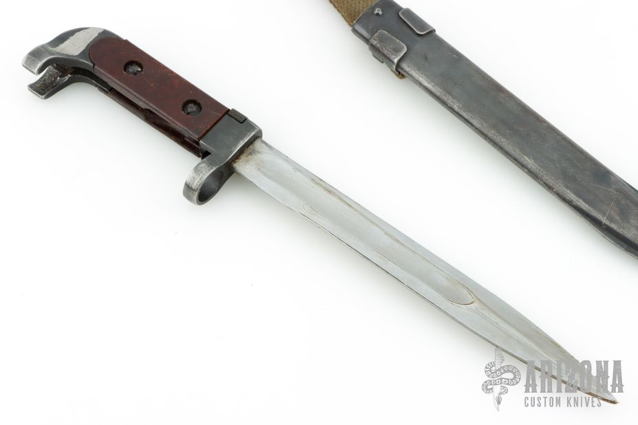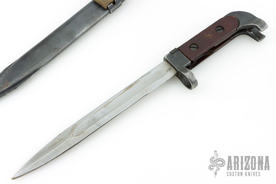 This Russian (possibly Finnish) AK47 bayonet, it has a silver blade with false top edge, fuller, .193" blade stock and .870" blade depth, hidden tang construction. The handle has a steel guard and butt with a dark red plastic handle. Comes with original scabbard. Has scuffs and scratches, good condition otherwise.