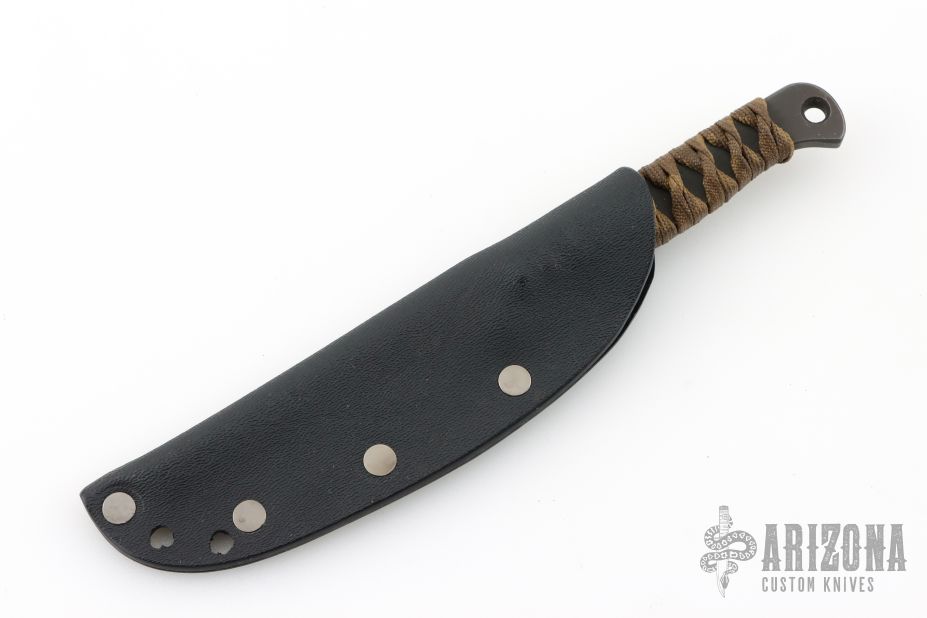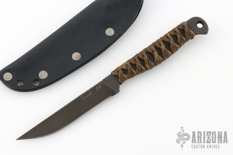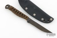 This custom fixed blade by Dennis Cook features a black coated blade with notched thumbrest, .208" blade stock and .613" blade depth, full tang construction with a cord wrapped handle. Nice feel in handle. Includes a kydex sheath. Excellent condition.