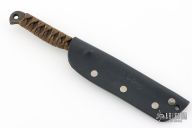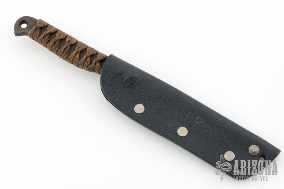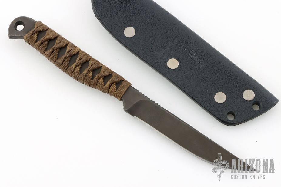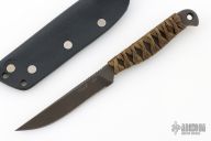 This custom fixed blade by Dennis Cook features a black coated blade with notched thumbrest, .208" blade stock and .613" blade depth, full tang construction with a cord wrapped handle. Nice feel in handle. Includes a kydex sheath. Excellent condition.